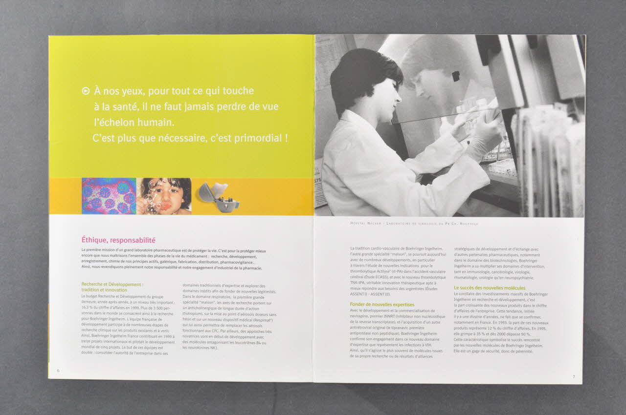 A l'intérieur, à chaque double page figure une grande photographie noir et blanc de laboratoires, pharmacies ou hôpitaux avec des activités liées à Boehringer. Des bandeaux sont composés de petites vignettes couleur.
