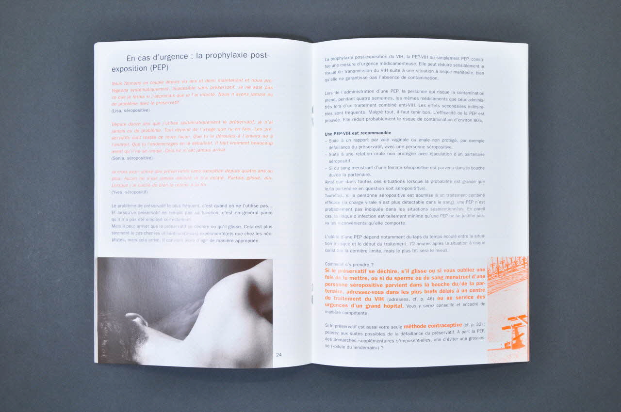 Sommaire - p.4 Quand, à qui et que dois-je dire de ma séropositivité ? "Dans votre vie quotidienne, la décison de dévoiler votre statut sérologique ou votre maladie vous appartient." - p.6 Faire connaissance - La première fois. "Soumise à la protection de la personnalité, la séropositivité de quelqu'un ne peut être dévoilée sans le consentement de la personne séropositive" - p.8 Informer le partenaire lors de relations sexuelles passagères "Les personnes séropositives ne portent pas seules la responsabilité du sexe à moindre risque' - p.10 Amour, désir et sexe : on peut faire tant de choses ! - p.13 Se caresser l'un l'autre avec la bouche - c'est possible ? - p.16 Autres maladies sexuellement transmissibles - p.18 "En" parler - p.20 Le préservatif - une partie des préliminaires - p.22 Des points importants concernant le préservatif (qualité, lubrifiant, conservation, mode d'emploi) - p.24 En cas d'urgence : la prophylaxie post exposition (PEP). "Si le préservatif se déchire, s'il glisse ou si vous oubliez une fois de le mettre, ou si du sperme ou du sang menstruel d'une personne séropositive parvient dans la bouche du / de la partenaire, adressez-vous dans les plus brefs délais à un centre de traitement du VIH ou au service des urgences d'un grand hôpital" - p.26 Renoncer au préservatif ? Dans le cas de partenaires sérodifférents :"il est impératif que tous deux soient conscients des risques qu'ils encourent, qu'ils en parlent ensemble et expliquant leur choix. Enfin, les deux partenaires doivent être d'accord sans aucune réserve." - p.28 Ne peut-on pas tout de même éviter le préservatif si... ? "Si, lors de la dernière mesure, la charge virale se situait au dessous du seuil de détection, le risque d'une transmission sexuelle du VIH est certes massivement réduit. Mais on ne peut exclure une transmission. C'est pourquoi le sexe à moindre risque reste important." / Attention à la transmission de virus résistants / "Les rapports protégés sont vivement recommandés aux couples dont les deux partenaires sont séropositifs si tous deux suivent un traitement combiné anti-VIH et que celui-ci ne s'avère pas assez efficace chez l'un des partenaires ou sur les deux ; si seul un des deux partenaires suit un traitement combiné anti-VIH ; s'il est possible qu'une autre maladie soit transmise sexuellement." - p.32 Contraception - p.34 Désir d'enfant - p.36 Des moments difficiles : Le résultat du test, les premiers temps / commencer un traitement combiné / La maladie se déclare / Penser pour son / sa partenaire / Séparation "S'il y a séparation, un point devra absolument être observé : l'état sérologique du / de la partenaire séropositif (ve) ne devra être révélé à personne" - p.40 Troubles survenant suite à une infection VIH non traitée ... - p.42 ... ou aux effets secondaires d'un traitement combiné anti-VIH - p.44 Conseils et soutien (associations...) - p.46 Adresses utiles / Intérieur. Fond blanc, impression en noir. Témoignages et remarques en marge en orange. Points importants en orange. 15 photos noir et blanc en bas de page gauche : baiser, douche, mains, caresses, tasse de café, bébé, couple parlant, femme au téléphone. Vignettes colorées en orange en bas de page droite. Texte émaillé, en débuts de paragraphe, de nombreux témoignages de personnes séropositives ou de partenaires séronégatifs.