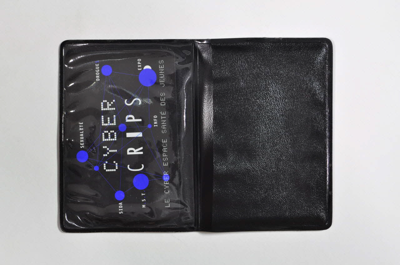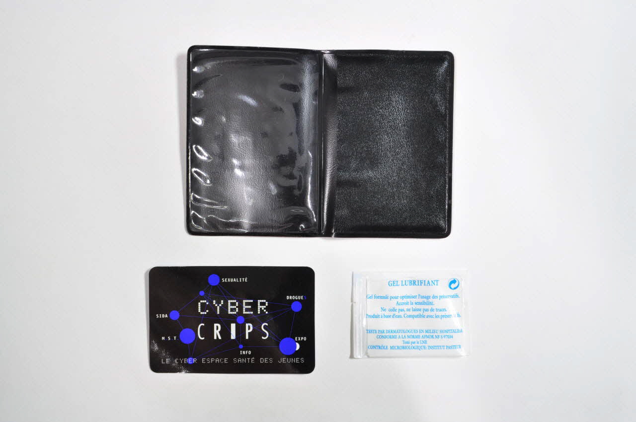 A l'intérieur, le volet gauche présente une pochette transparente, dans laquelle est glissée une petite carte en papier plastifié. Celle-ci présente, sur fond noir, de nombreuses inscriptions relatives à un espace santé dédié aux jeunes. Le volet de droite présente une pochette noire, dans laquelle sont glissés les objets 2002.104.23.2 et.3.Inscriptions