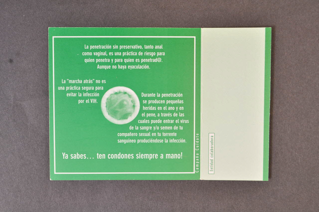 La penetración sin preservativo, tanto anal // como vaginal, es una práctica de riesgo [...] // Ya sabes... ten condones siempre a mano !, versoSous-titre, texte