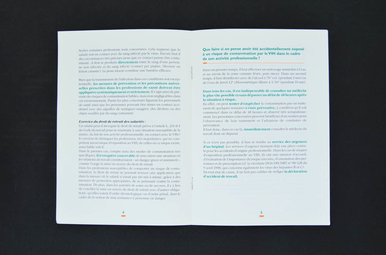 - Qu'est-ce que l'infection par le VIH ? // - Qu'est-ce que le sida ? // - Comment le virus se transmet-il ? // - Y-a-t-il un risque à côtoyer des collègues de travail atteints de l'infection par le VIH ? // - Peut-on être contaminé du fait de son activité professionnelle ? // - Que faire si on pense avoir été accidentellement exposé à un risque de contamination par le VIH du fait de sont activité professionnelle ? // - Peut-on demander à un salarié s'il est atteint de l'infection par le VIH ? // - Un salarié atteint de l'infection par le VIH peut-il continuer à travailler ? (inscriptions en noir sur la page au dos de la couverture), à l'intérieurLogo