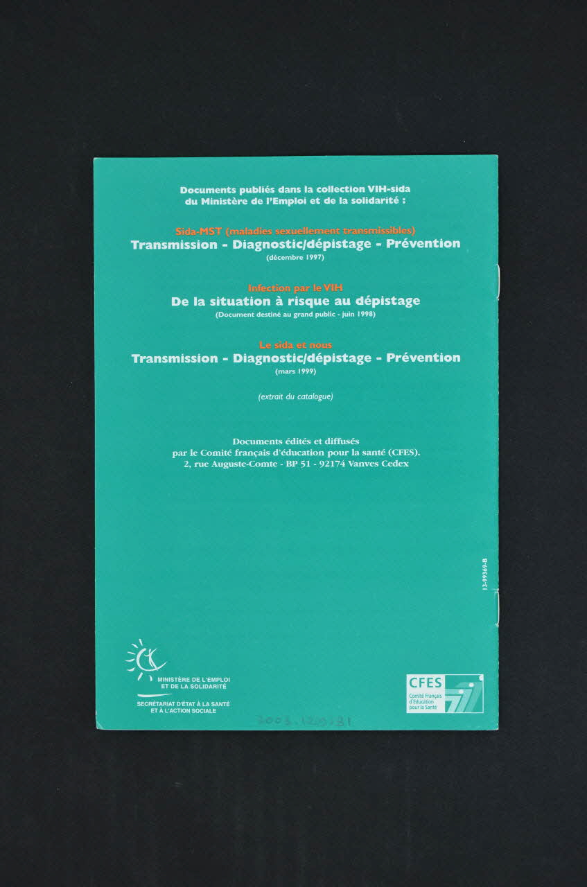 - MINISTERE DE L'EMPLOI // ET DE LA SOLIDARITE // SECRETARIAT D'ETAT A LA SANTE // ET A L'ACTION SOCIALE // - CFES // Comité Français // d'Education // pour la Santé (deux logos en blanc dans les coins inférieurs droit et gauche), versoMINISTERE DE L'EMPLOI // ET DE LA SOLIDARITE // SECRETARIAT D'ETAT A LA SANTE // ET A L'ACTION SOCIALE (logo en blanc au milieu en bas), sur la couvertureDate