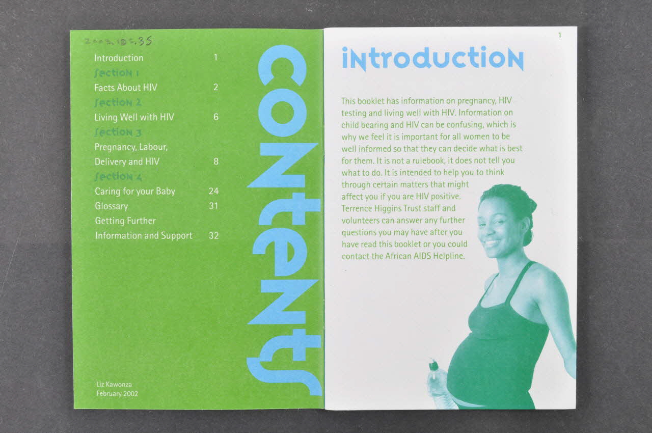 L'avant de la couverture est à fond bleu, avec une photographie en noir et blanc du visage d'une filette d'origine africaine. Le côté gauche est orné de zig-zags verts et violets. Le logo de l'association "terrence higgins trust" est imprimé en haut, à droite, en blanc sur un carré vert. Le dos de la couverture est violet avec une reprise du logo en haut à droite et les coordonées de l'association imprimées en blanc dans le bas. La brochure contient des textes en anglais, imprimés en bleu et vert. Elle est divisée en quatre parties, avec des conseils spécifiques pour les femmes africaines : - faits sur le VIH (essentiellement informations sur le test de dépistage) -mener une vie normale avec le VIH (être optimiste, en parler, ce qui ne transmet pas le VIH dans la vie quotidienne) - grossesse, accouchement et VIH (risque de transmission à l'enfant, risques de transmission dans le couple, lavage de sperme, problèmes mineurs de la grossesse, autres infections transmissibles au bébé, traitements, médecine traditionnelle, soins médicaux gratuits) - soins pour le bébé (ne pas allaiter au sein, allaitement au biberon, dépistage du bébé, en parler au médecin généraliste ? - Glossaire - Informations supplémentaires : coordonnées, en plus de l'association de African AIDS Helpline, Blackliners, UK Coalition of people living with HIV/AIDS Dernière page : liste des antennes régionales de l'association.Inscriptions