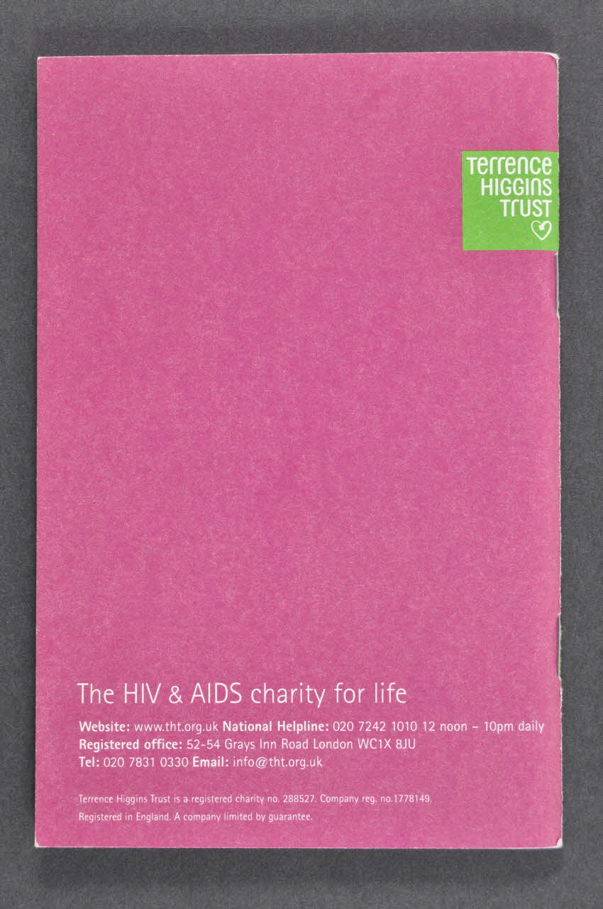 TERRENCE / HIGGINS / TRUST (Logo présent sur la couverture, au recto et au verso. Il est imprimé en haut, à droite, le long du bord, en blanc sur un carré vert avec un coeur formé d'une flèche.), sur la couvertureDate, auteur