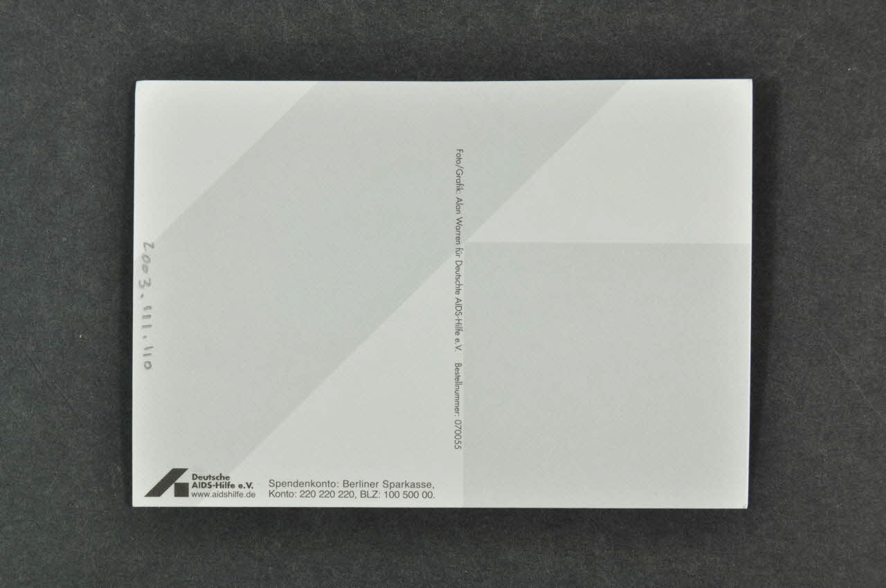 Deutsche // AIDS-Hilfe e.V. (inscription en noir dans le coin inférieur gauche), versoDeutsche // AIDS-Hilfe e.V. (inscription en blanc dans le coin inférieur droit, sous le texte), rectoDécor