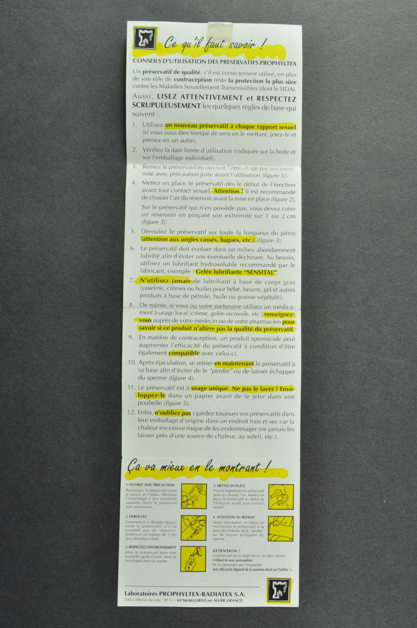 Sur le devant du dépliant est tenu avec du scotch un préservatif contenu dans une enveloppe rectangulaire dorée sur laquelle est écrit en noir : "GRATUIT" Prophyltex fins (avec le logo : une tour).
