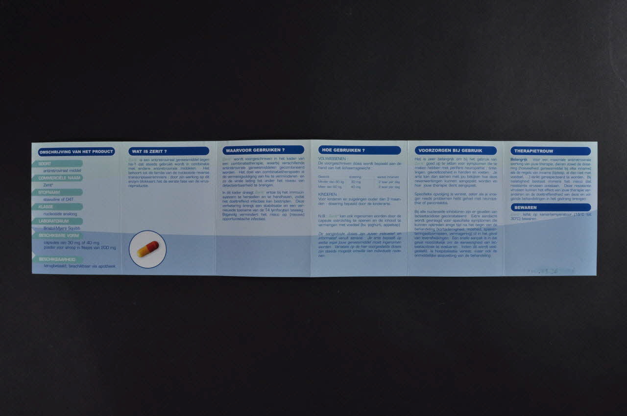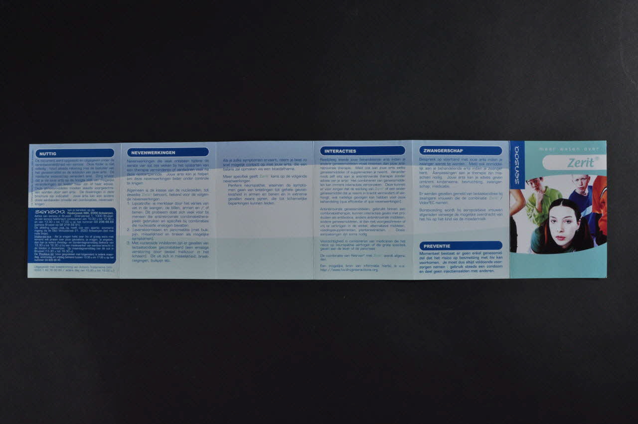 Meer weten over Zerit (Titre du dépliant en haut de la couverture.)OMSCHRIJVING VAN HET PRODUCT // WAT IS ZERIT ? // WAARVOOR GEBRUIKEN ? // HOE GEBRUIKEN ? // VOORZORGEN BIJ GEBRUIK // THERAPIETROUW // BEWAREN // NUTTIG // NEVENWERKINGEN // INTERACTIES // ZWANGERSCHAP // PREVENTIE (Titres des rubriques du dépliant.)sensoa (Nom de l'association écrit en blanc dans un cartouche bleu en haut à gauche de la couverture.)Décor