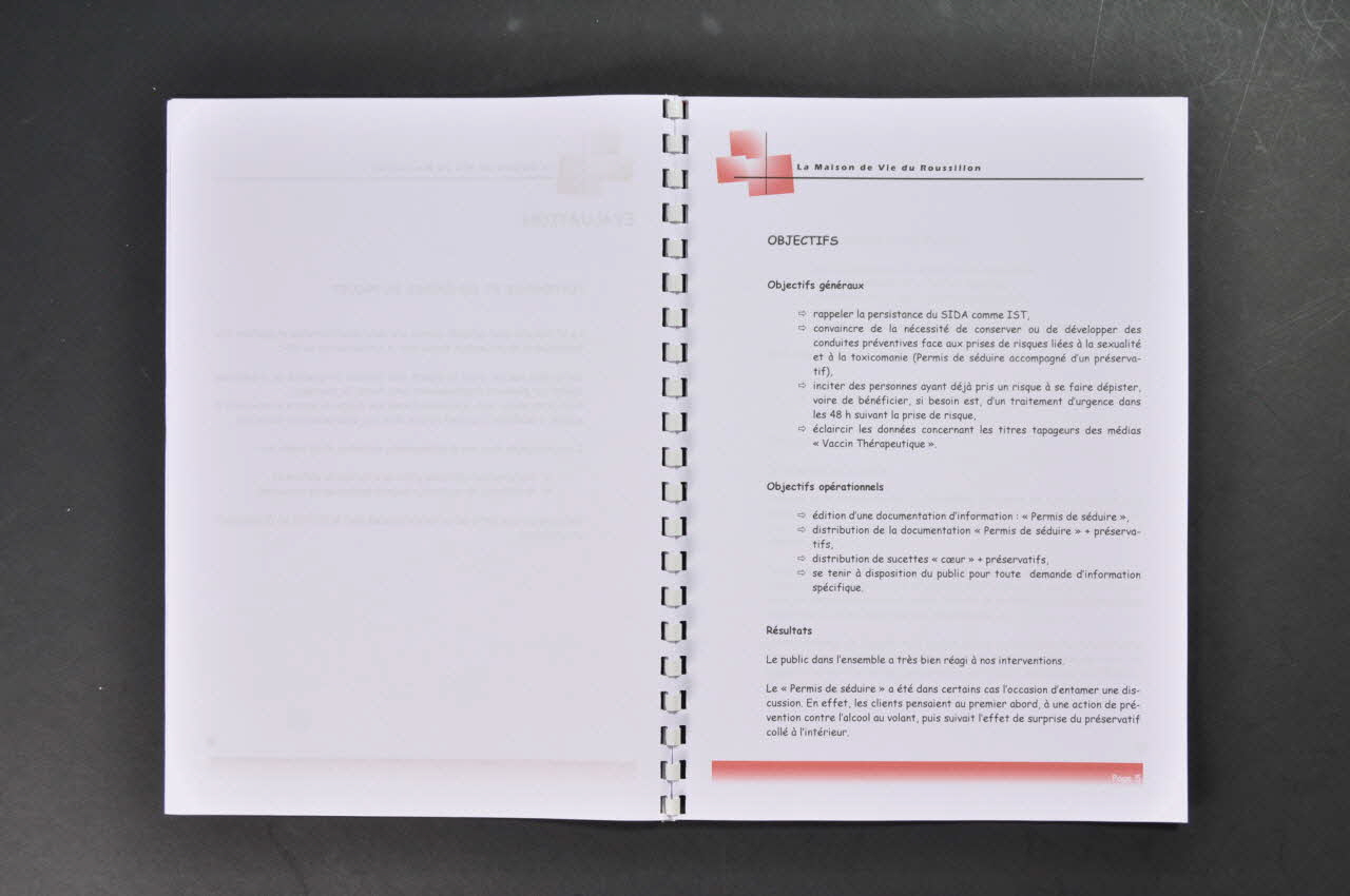 Précisions sur le contenu : Visite de 5 établissements nocturnes. Distribution de "Permis de séduire" avec préservatifs, de sucettes en forme de coeurs avec préservatifs, d'autocollant :"offrez-lui un cadeau utile" p.9 Données : 4 intervenants / 5 établissements visités / 1100 personnes rencontrées / 800 "Permis de séduire" distribués / 1100 préservatifs distribués. Annexes p.12 et 13 Photo du Permis de séduire Recto et verso. Réalisé par la Maison de vie du Roussillon. Document tiré à 5.000 exemplaires. (texte sur le dépistage / Numéros utiles / Transmission et risques / Le préservatif) p. 14 Photo : Préservatifs montés sur des sucettes. 300 exemplaires.