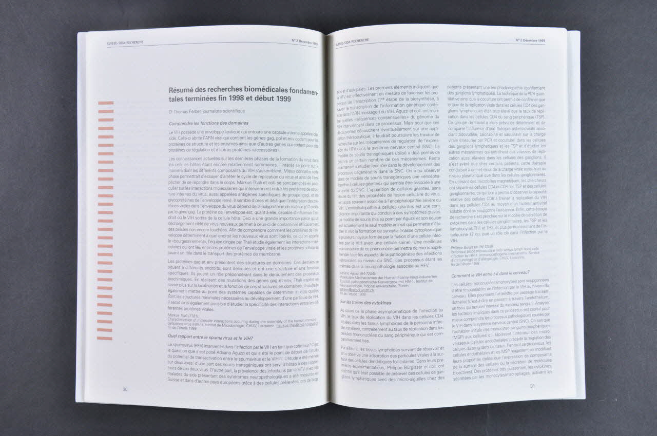 Il s'agit d'une revue gratuite qui paraît deux fois par an. Tirage : 18.700 ex (6.300 français, 12.400 allemand) Résumé - Michel P. Glauser et Heidi Diggelmann. Editorial et bienvenue : Les changements institutionnels de l'organisation de le recherche sur le sida en Suisse Evaluation de la recherche sur le sida - Cécile Billotte Widmann et Jérôme Billotte : Comparaison internationale et évaluation de la recherche suisse sur le sida 1991-1998 (en anglais) - Jürgen von Troschke : Evaluation du Programme suisse de promotion de la recherche sur le sida Recherche biomédicale fondamentale - Max Hess : Sida en recherche fondamentale, l'union fait la force (Financements par la Commission fédérale de contrôle de la recherche sur le sida et le Fonds National Suisse) - Thomas Ferber : Le "Centre Lémanique de Recherche sur le Sida" (CLRS) (Laboratoire d'immunopathologie du sida de Lausanne) - Thomas Ferber : Résumé des recherches biomédicales fondamentales terminées fin 1998 et début 1999 - Liste des recherches biomédicales en cours Recherche clinique - Bernard Hirschel : La recherche clinique : occasions saisies - occasions manquées - Patrick Francioli : L'étude suisse de cohorte VIH / Swiss HIV Cohort Study : structure et fonctionnement (organisation de la recherche) - Christophe Rudin : L'étude suisse de cohorte VIH mère-enfant (transmission et thérapie antirétrovirale au cours de la grossesse) - Thomas Ferber : Résumé des recherches cliniques terminées fin 1998 et début 1999 - Liste des recherches cliniques en cours Recherche en sciences sociales et santé publique - Andrée Helmonger : Sciences sociales et santé publique : passé et avenir - Bertino Somaini : Recherche en santé publique dans le domaine du VIH/sida : passé et avenir - Susanne Schaaf : La conférence de Thoune, 2 et 4 novembre 1999 - Liste des recherches en sciences sociales et en santé publique en cours