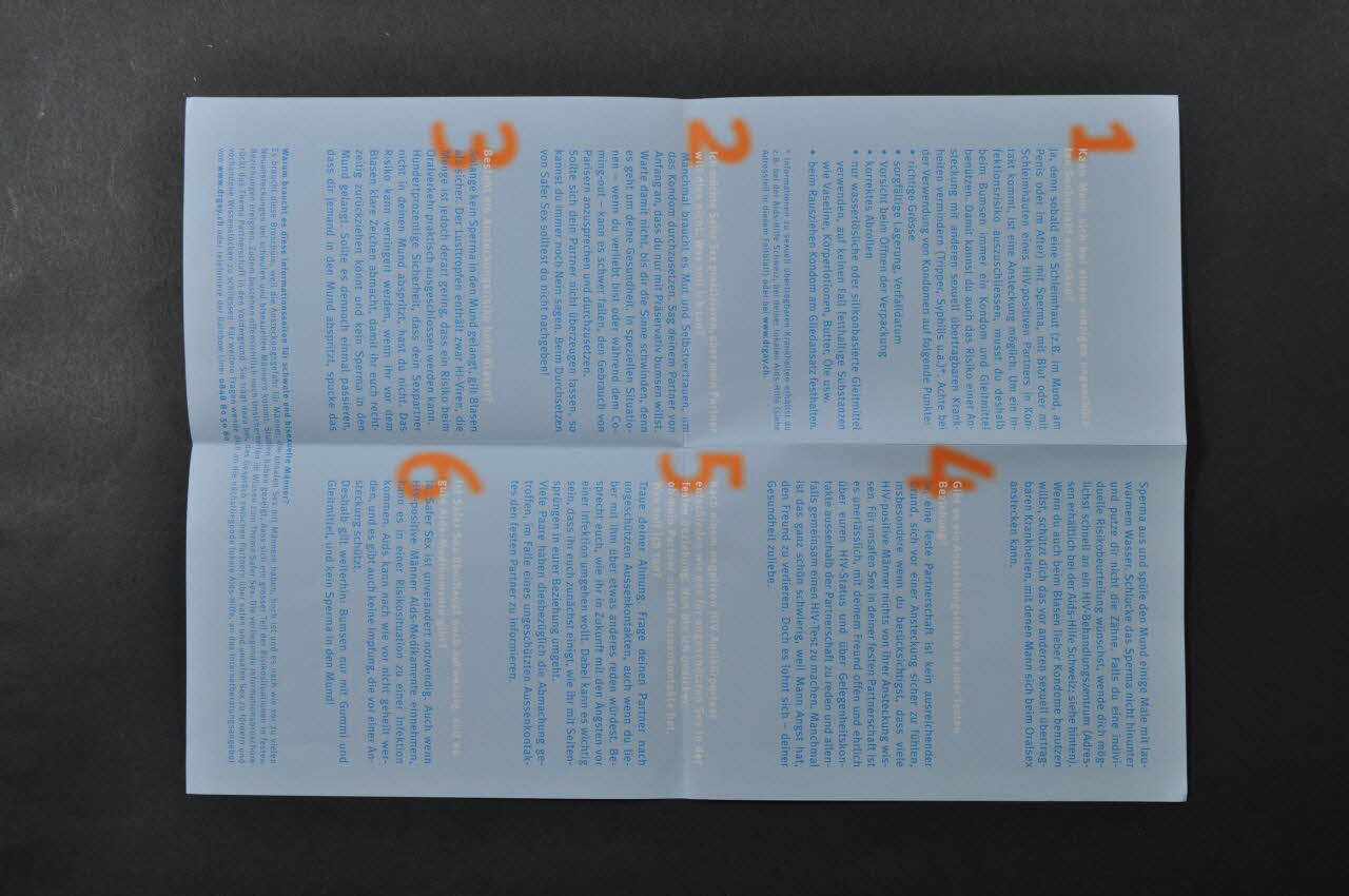 Dépliant, "Safer Sex. Die sechs häufigsten Fragen von Männern, die Sex mit Männern haben, und die Antworten dazu." (Faire l'amour à moindre risque. Réponse aux six questions les plus fréquemment posées par les hommes ayant des relations sexuelles avec d'autres hommes)