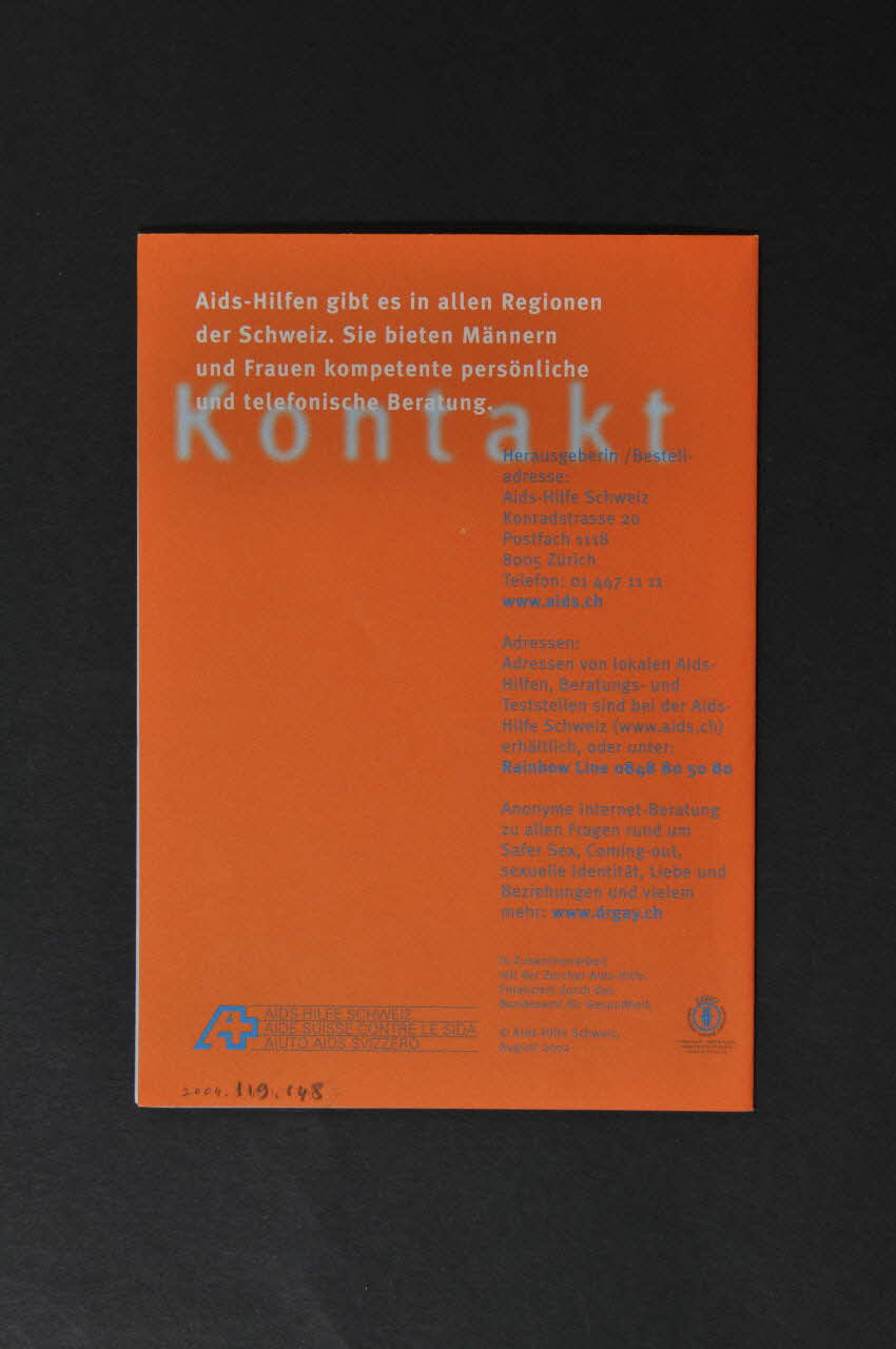 AIDE SUISSE CONTRE LE SIDA (Logo de l'association imprimé en bleu sur orange dans le coin en bas à gauche), versoTexte
