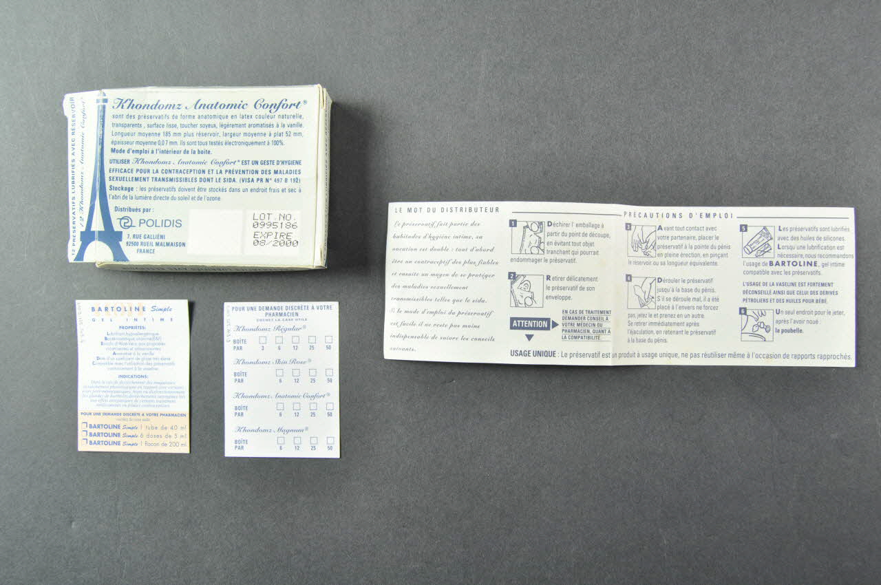 Au dos se trouve une description des préservatifs, les conditions de stockage. A l'intérieur est rangée une petite feuille de papier rectangulaire (.3) à cocher "pour une demande discrète à votre pharmacien" (préservatif) et une autre pour gel Bartoline (.4) On y trouve également un dépliant (.2) : "Comment s'utilise un préservatif". Y figurent des précautions d'emploi avec six schémas (déchirer l'enveloppe / retirer le préservatif / le placer/ le dérouler / lubrifiant / poubelle) Au verso se trouve "Le langage des préservatifs" et une présentation des différents préservatifs de la marque et de leurs caractéristiques (Regular / Skin Rose / Anatomic Confort / Magnum)Inscriptions
