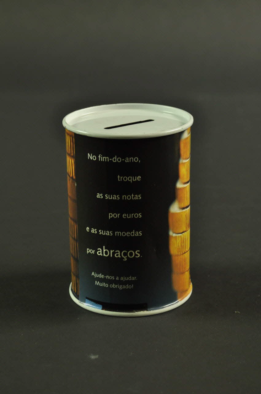 De forme cylindrique, la tirelire est en métal peint en blanc. Le corps est recouvert d'un papier collé, sur lequel des pièces de monnaie sont imprimées sur fondnoir. Des inscriptions blanches, ainsi qu'un logo sont imprimés.Inscriptions