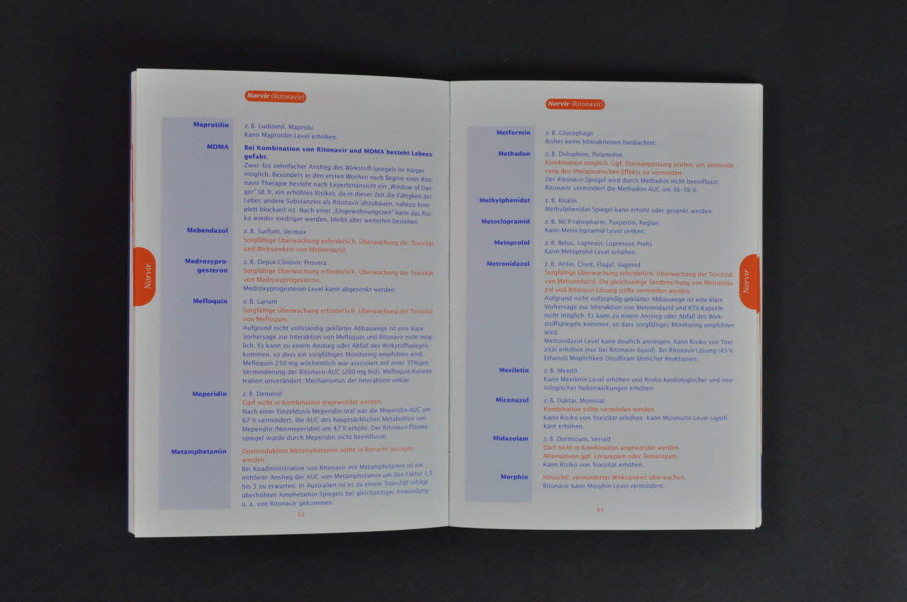 Présentation sous forme de dictionnaire, avec onglets oranges des traitements en vigueur en septembre 2000 et des interactions médicamenteuses avec d'autres antirétroviraux et d'autres traitements.Décor