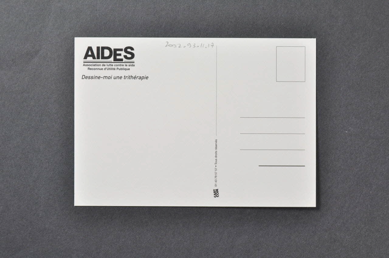 AIDES // Association de lutte contre le sida // Reconnue d'Utilité Publique // // Dessine-moi une trithérapie (angle supérieur gauche), versoSignature, auteur