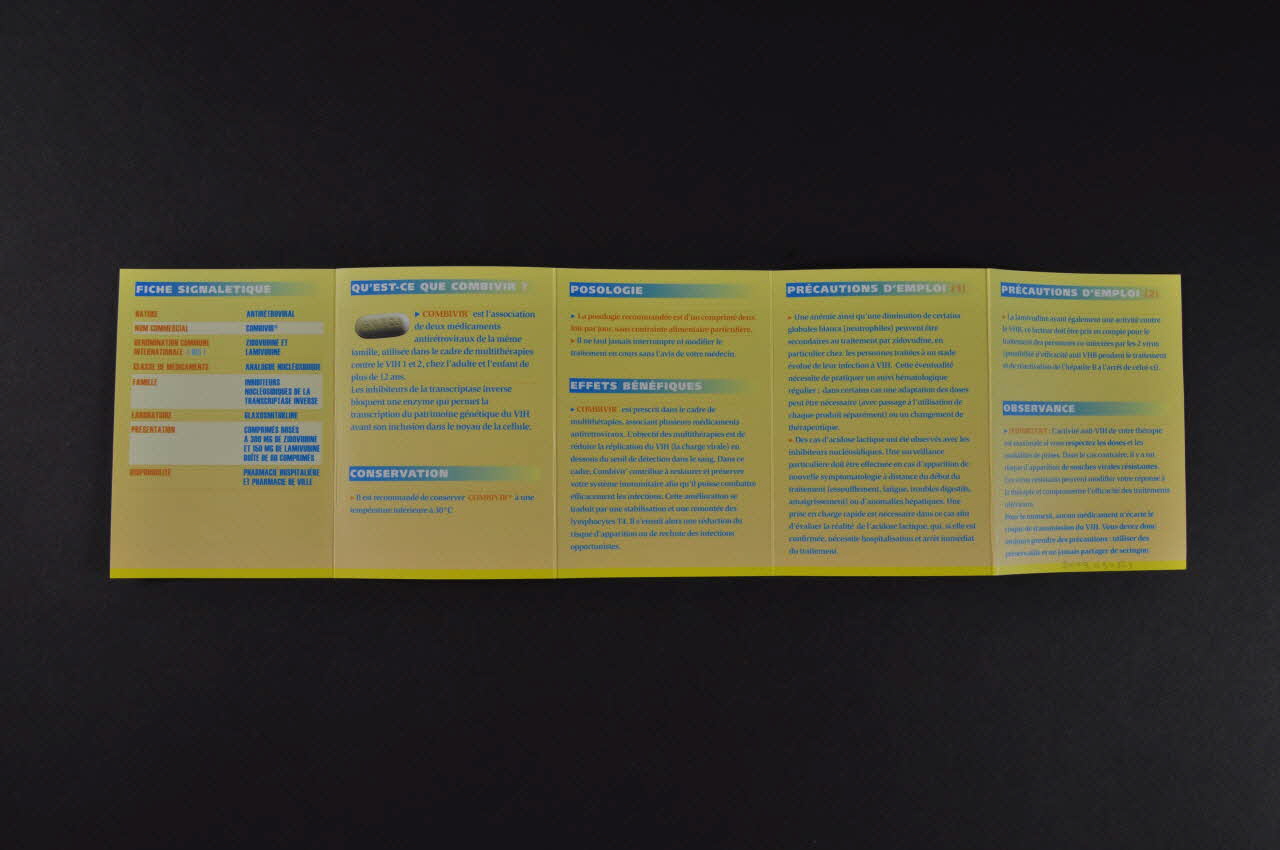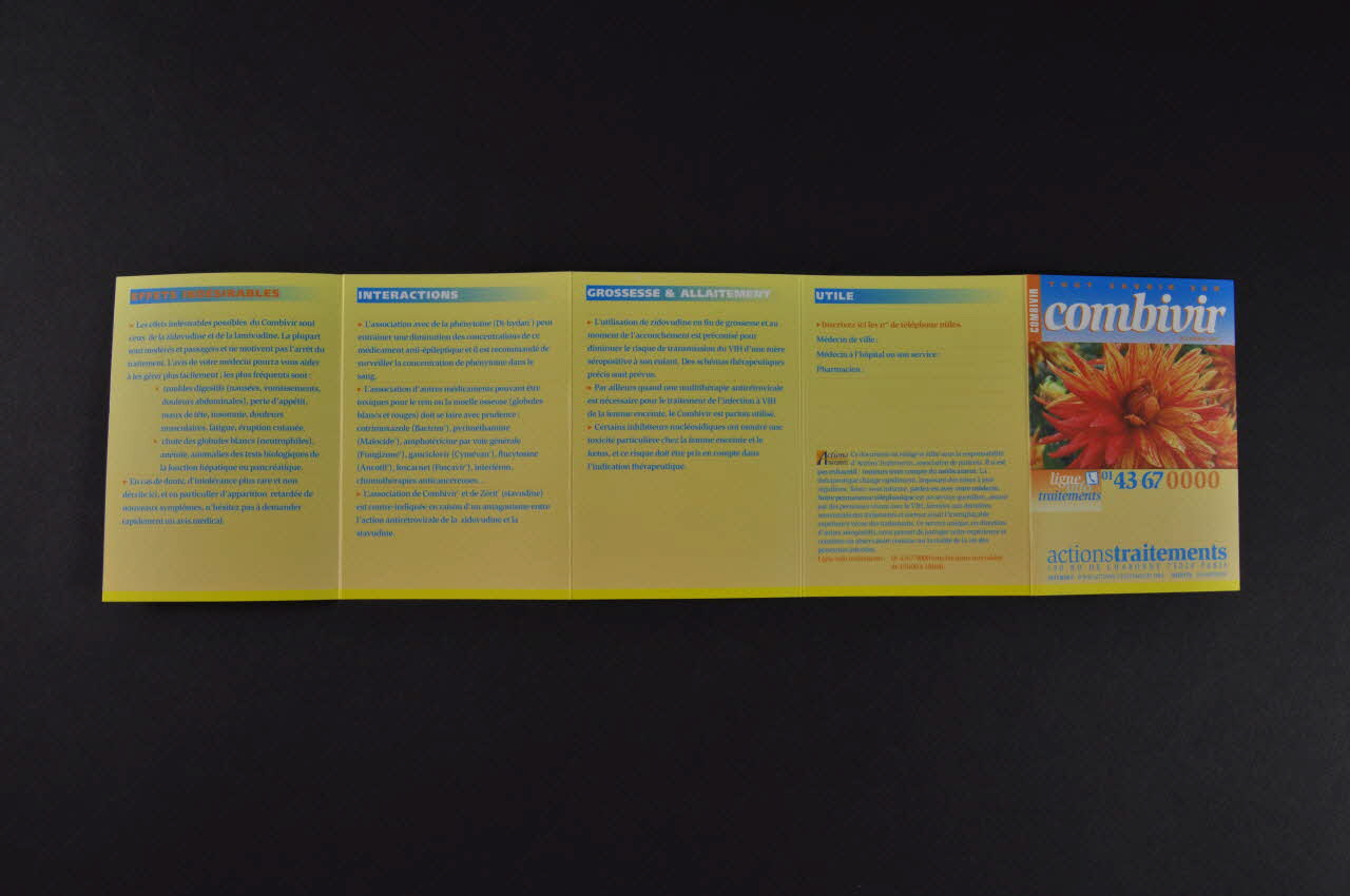 TOUT SAVOIR SUR // combivir // DECEMBRE 2002 (Titre et date de parution du dépliant imprimé en haut de la couverture.)FICHE SIGNALETIQUE // QU'EST CE QUE COMBIVIR ? // EFFETS BENEFIQUES // PRECAUTIONS D'EMPLOIUTILISATION // OBSERVANCE // EFFETS INDESIRABLES // INTERACTIONS // CONTRE-INDICATIONS // UTILE (Intitulés des rubriques du dépliant.)ligne info // traitements 01 43 67 00 00 // // actionstraitements // 190BD DE CHARONNE 75020 PARIS // INTERNET WWW.ACTIONS-TRAITEMENTS.ORG MINITEL 3614HIVINFO (Numéro de téléphone et coordonnées de l'association sur la couverture. Le numéro de téléphone est imprimé sous l'image. Le reste est imprimé en bas.)Décor