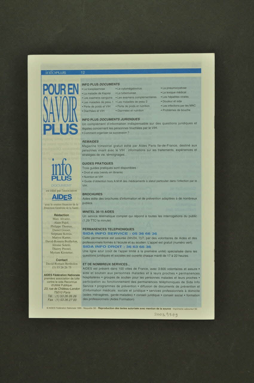 AIDES / info / PLUS / EDITORIAL [...] / DOCUMENT DECEMBRE 1995 / Diarrhées et VIH [...] (Au sein de la page entière. De haut en bas et de gauche à droite.), sur la couvertureSous-titre