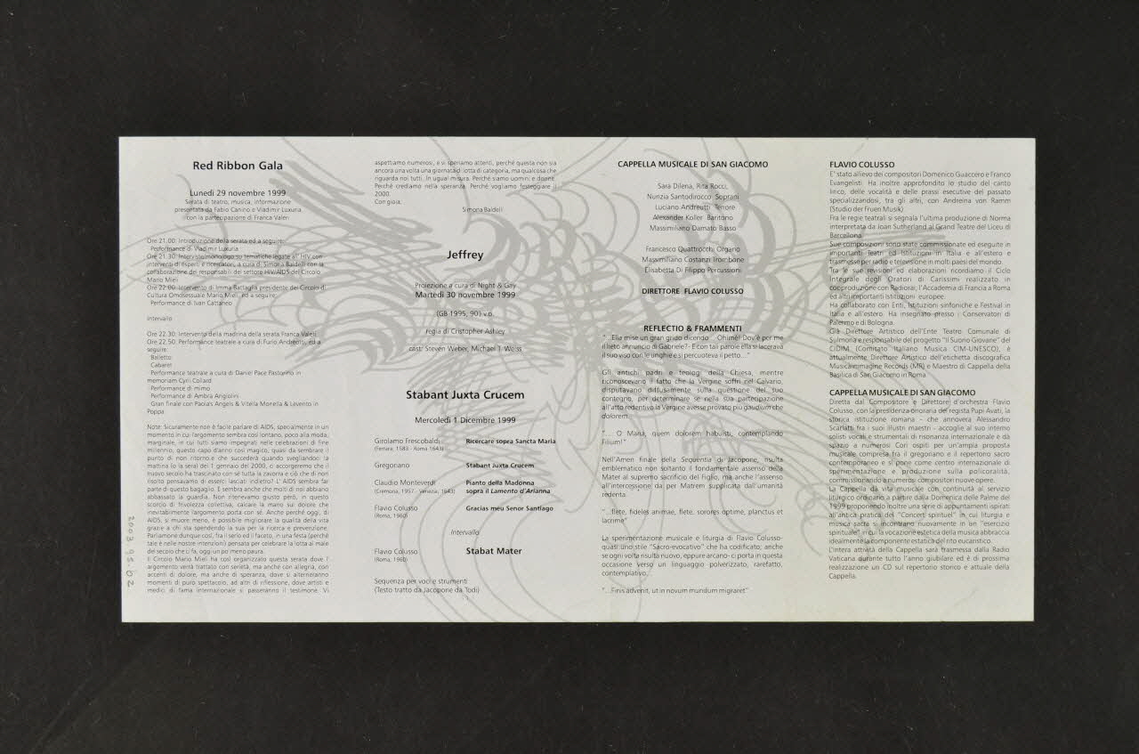 AIDS la vera malattia è la discriminazione... non lasciarti contagiere ! (Imprimé en noir et blanc sur bleu, au dessus du programme), rectoSicuramente non è facile parlare di AIDS [...] (Imprimé en noir), versoDécor
