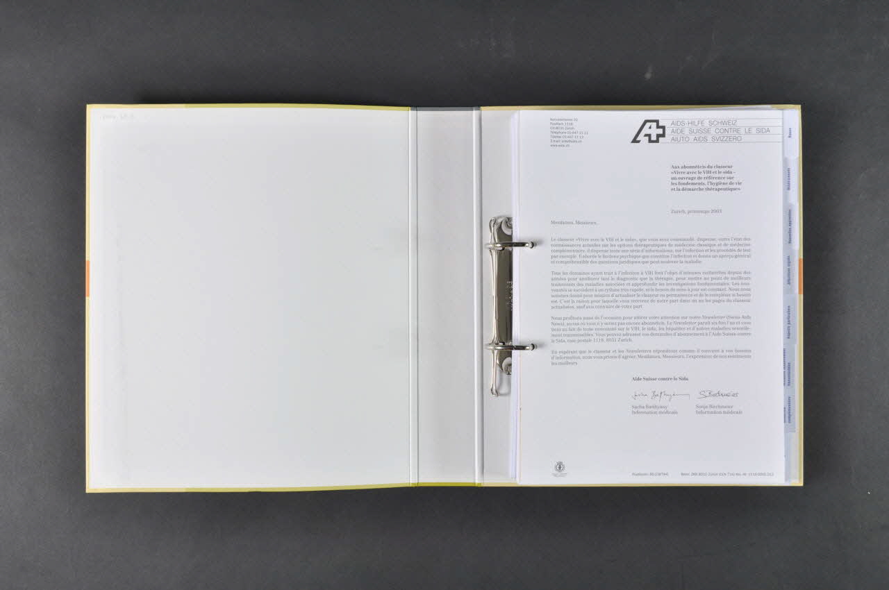 Classeur à anneaux, fonctionnant avec un abonnement à des pages actualisées chaque année. Version française ; version allemande en 2004.048.08. Destiné "aux personnes vivant avec le VIH ou le sida, à leurs proches et à leurs ami(e)s, au corps médical, au personnel soignant, ainsi qu'à toute personne désireuse de s'informer sur les différentes facettes de cette maladie."