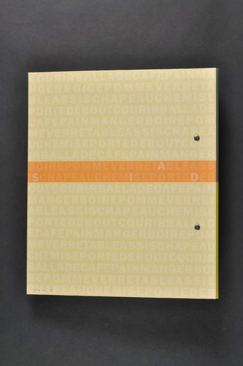 Couverture en carton avec grands anneaux de métal formant classeur. Fond vert pâle avec une marge verticale jaune clair à droite. En sous impression, série de mots apparemment de la vie quotidienne : courir, ballade, pain, manger, boire, pomme, verre, table, café, assis, chapeau, porte, debout, etc. Au centre sur un bandeau gris : "Vivre avec le VIH et le sida / Un ouvrage de référence sur les fondements, l'hygiène de vie et la démarche thérapeutique.". Tout en bas, le logo de l'association. A l'intérieur, huit pages intercalaires en carton fond gris délimitant huit parties avec bande bleue centrale et nom du chapitre en blanc. Lettre de présentation en première page.Inscriptions