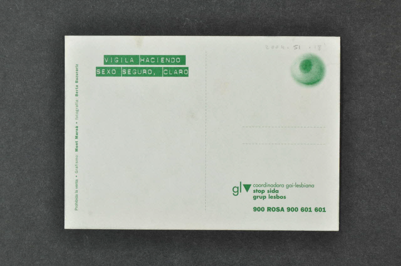 Elle est imprimée en couleur et est écrite en espagnol. Au recto, une photo colorée en gris vert représente deux femmes torse nu, s'embrassant. En bas, à droite, en petites capitales blanches et grises sur bandeau orange, est inscrit un titre. Au verso, le fond blanc est divisée en deux parties. A droite, se trouve l'emplacement de l'adesse et du timbre (en forme de sein). En bas, il y a un logo. Au milieu de la carte, se situe une fine ligne en pointillés, à la verticale. En haut à gauche on trouve un slogan. Les impression au verso sont en vert.Inscriptions
