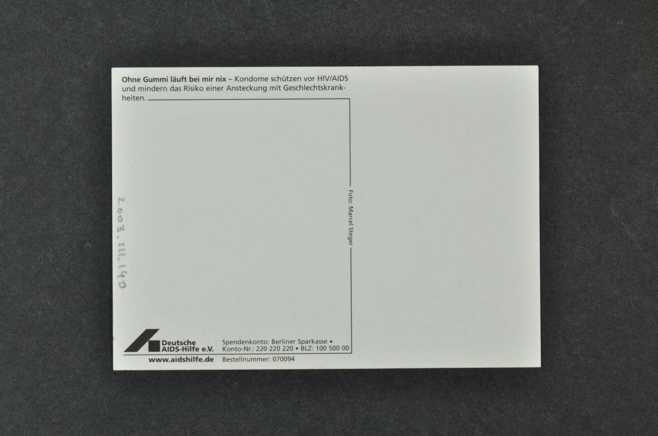 Ohne Gummi läuft bei mir nix - Kondome schützen vor HIV/AIDS // und mindern das Risiko einer Ansteckung mit Geschlechtskrankheiten (inscription en noir sur fond blanc dans le coin supérieur gauche), versoLogo, adresse, nom d'association