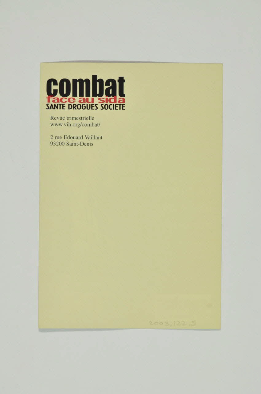 combat // face au sida // SAINTE DROGUES SOCIETE // Revue trimestrielle // www.vih.org/combat/ // 2 rue Edouard Vaillant // 93200 Saint-Denis (Les coordonnées de l'association sont notées dans l'angle gauche de la partie supérieure.), versoLogo, nom d'association