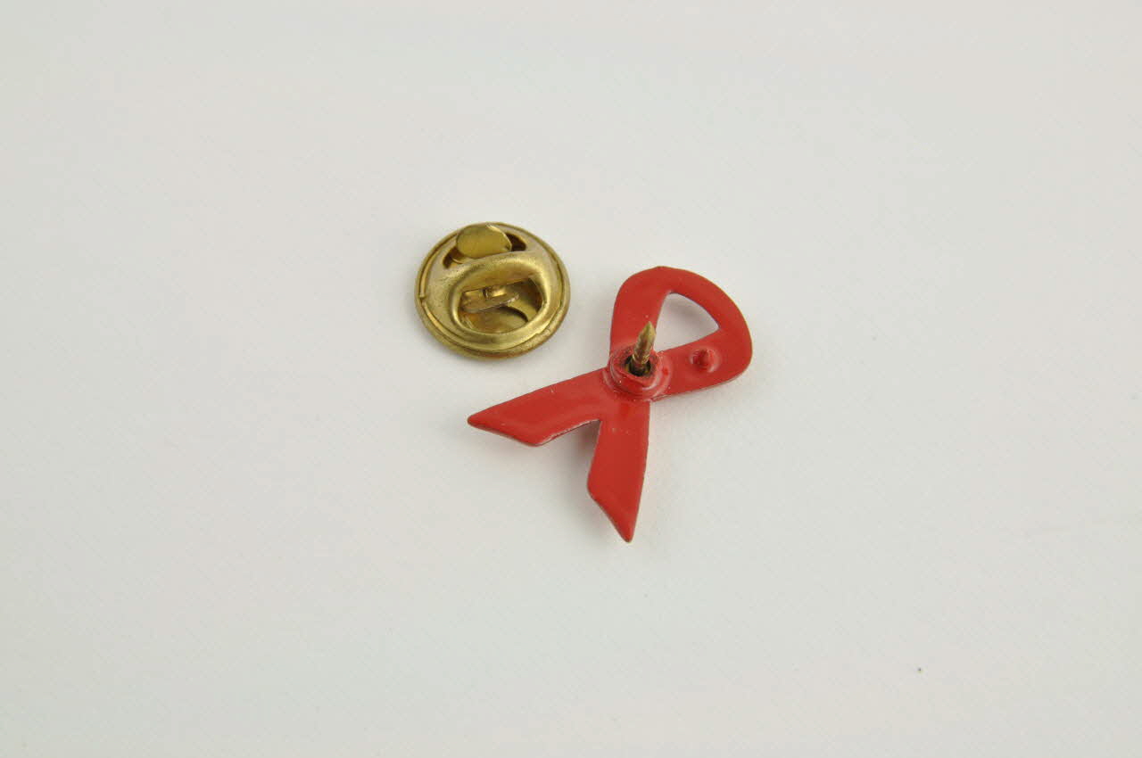Pin's en métal ayant la forme d'un ruban rouge, fermé par un fermoir doré.Décor