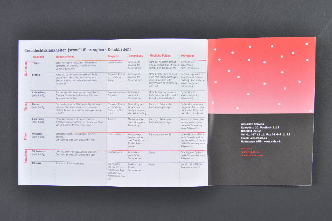 Aids und andere sexuelle // übertragbare Krankheiten [...] ......7 // Der HIV-Test [...] ......9 // Hepatitis [...] ....12 // Safer Sex oder: // Wie schütze ich mich // am sichersten beim Sex?[...] ....15 // Lass uns über Präservative reden [...] ....19 // Deine Gesundheit ist kein Zufall, // du kannst sie beeinflussen! [...] ....23 // Empfängnisverhütung [...] ....25 // Krank! Wer zahlt? [...] ....29 // Rechte und Pflichten - // und was du darüber wissen musst! [...] .....31 // Sex, no drugs & roll, roll, roll [...] ....43 // Über Drogen und Sexarbeit [...] .....44 // Sexuell ûbertragbare Krankheiten [...] .....48 (Imprimé en page 5, en noir, souligné de rouge.), à l'intérieurConcernant la date