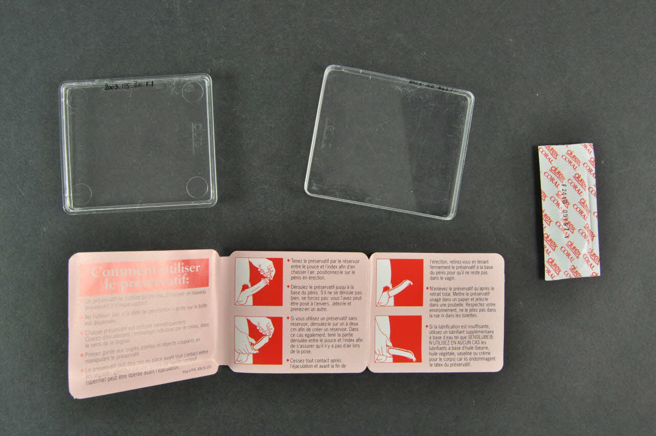 Il s'agit d'une boîte rectangulaire transparente en plastique, à travers laquelle on voit le devant et le dos d'un dépliant. La boîte peut s'ouvrir (.1.1-.1.2), et on trouve à l'intérieur deux objets: un dépliant (.3) et un préservatif (.2). Le dépliant est en trois volets, fait en papier imprimé principalement en rouge et blanc. Le premier volet a un dessin en jaune, où on entrevoit deux personnages sur deux chaises longues devant un coucher de soleil sur la mer. Le dessin est entouré de rouge avec plusieurs incriptions en couleur blanche autour. Au centre, en haut sont dessinnés deux colombes s'embrassant. La dernière face du volet a aussi un fond rouge avec plusieures inscriptions en blanc. Ici le texte indique la composition du produit, sa date limite d'utilisation, l'adresse de fabrication et son mode de conservation. L'intérieur du volet a un fond rose et comporte des nombreusses inscriptions en blanc et noir, celles-ci font réference au mode d'utilisation du préservatif. A l'intérieur sur le côté gauche sont présentés quatre dessins schématiques sur la manière d'utilisation du préservatif.