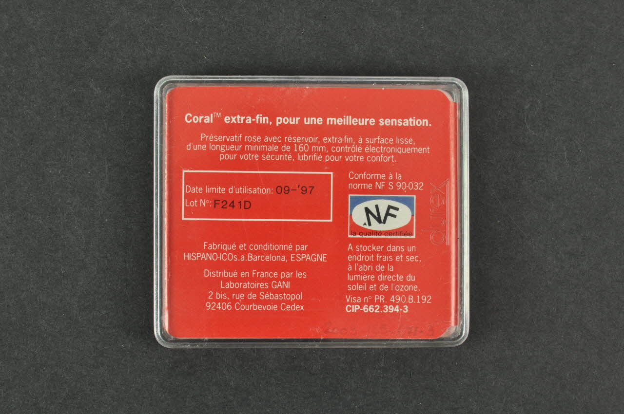 CORAL // contrôle électroniquement (Au centre du premier volet en haut sur le dessin jaune.), sur la couvertureMode d'emploi du préservatif (Sur la premièere page lors qu'on ouvre le dépliant.), à l'intérieurCoral TM extra-fin, pour une meilleure sensation. // Préservatif rose avec réservoir, extra-fin, à surface lisse, // d'une longueur minimale de 160 mm, contrôlé électroniquement pour votre sécurité, lubrifé pour votre confort. // Date limite d'utilisatio: 09-'97 // Lot N°: F 2 4 1D // Fabriqué et conditionné par // HISPANO-ICOs.a. Barcelona, ESPAGNE // Distribué en France par les // Laboratoires GANI // 2 bis, rue de Sébastopol // 9246 Courbevoie Cedex (En lettres blanches sur un fon rouge.), verso2 // PRESERVATIFS // EXTRA-FIN (Tout autour du dessin en haut en blanc.), sur la couverturedurex R, la sécurité... (En bas du dessin en blanc.), sur la couvertureMarque