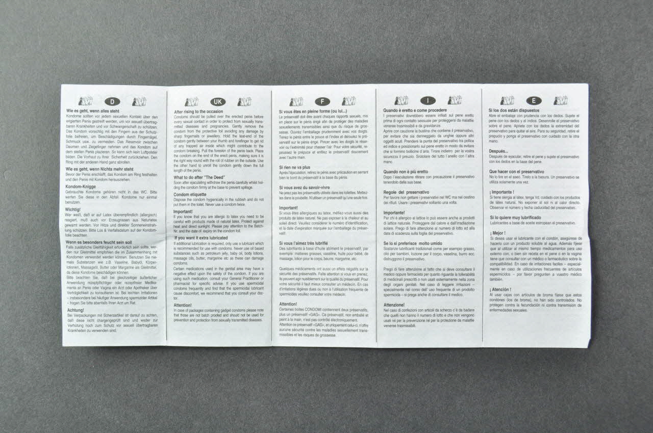 Dépliant de papier blanc, rectangulaire, imprimé en huit langues : allemand, anglais, français, italien, espagnol. portugais, grec, néerlandais, présentant une notice d'utilisation.