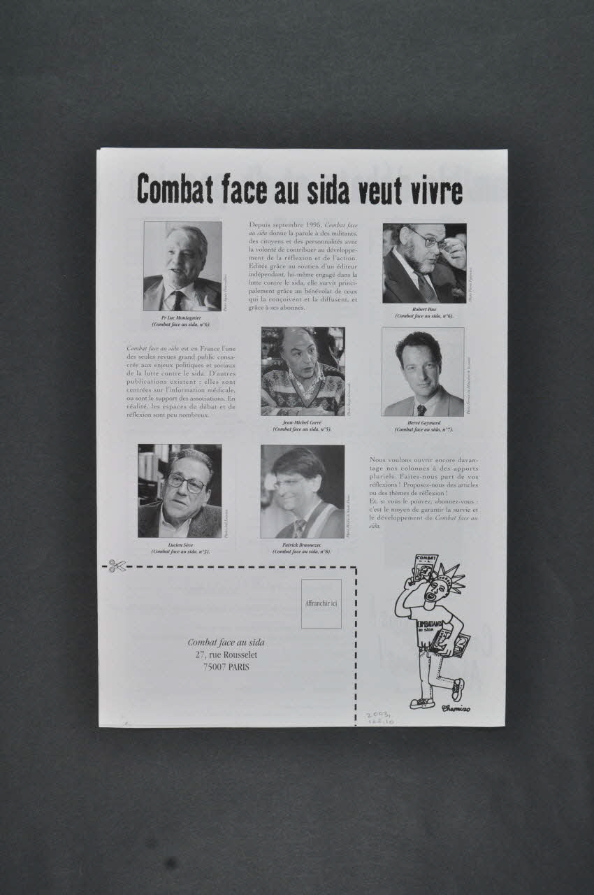 Le bulletin se présente sous la forme d'une brochure en papier de deux pages. Il s'agit du supplément de la revue. Au recto, sur un fond gris clair, le titre est inscrit en haut, dans de larges caractères fantaisie, blancs. En dessous, la date de publication est inscrite en lettres blanches sur un mince bandeau noir. Dessous, l'éditorial du rédacteur en chef est inscrit en lettres noires. A droite se trouve un dessin caricaturant le virus du sida sous la forme d'un gros monstre au visage couvert d'aiguilles, cherchant à saisir la Terre. Au verso, six photographies en noir et blanc, légendées, présentent des personnalités publiques qui ont été interviewées par l'association. La double page intérieure présente, à gauche, en colonne, la composition de l'équipe de rédaction. A droite, sept vignettes légendées exposent les publications antérieures (numéros 1à 8, sept-oct 1995 à avril-juin 1997). Dans l'angle inférieur droit, un bulletin d'inscription prédécoupé est représenté.Inscriptions
