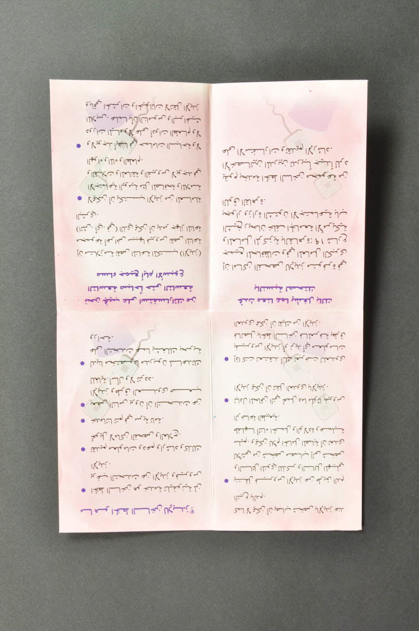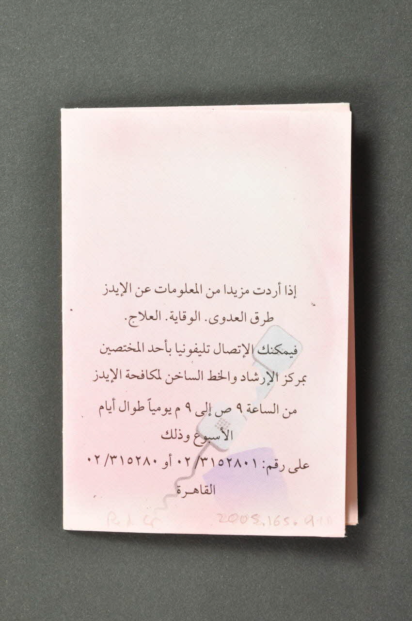 De forme rectangulaire, le dépliant en papier rose est plié en quatre. Sur le premier feuillet, des inscriptions roses et bleues en arabe sont imprimées. Dans la partie inférieure, une main tient un combiné de téléphone. Ce dessin se retrouve en filigrane sur tous les autres feuillets accompagné d'inscriptions en arabe noires et violettes. Sur le dernier feuillet apparaissent en noir les logos d'ONUSIDA et du Programme National Egyptien de prévention du sida.Décor
