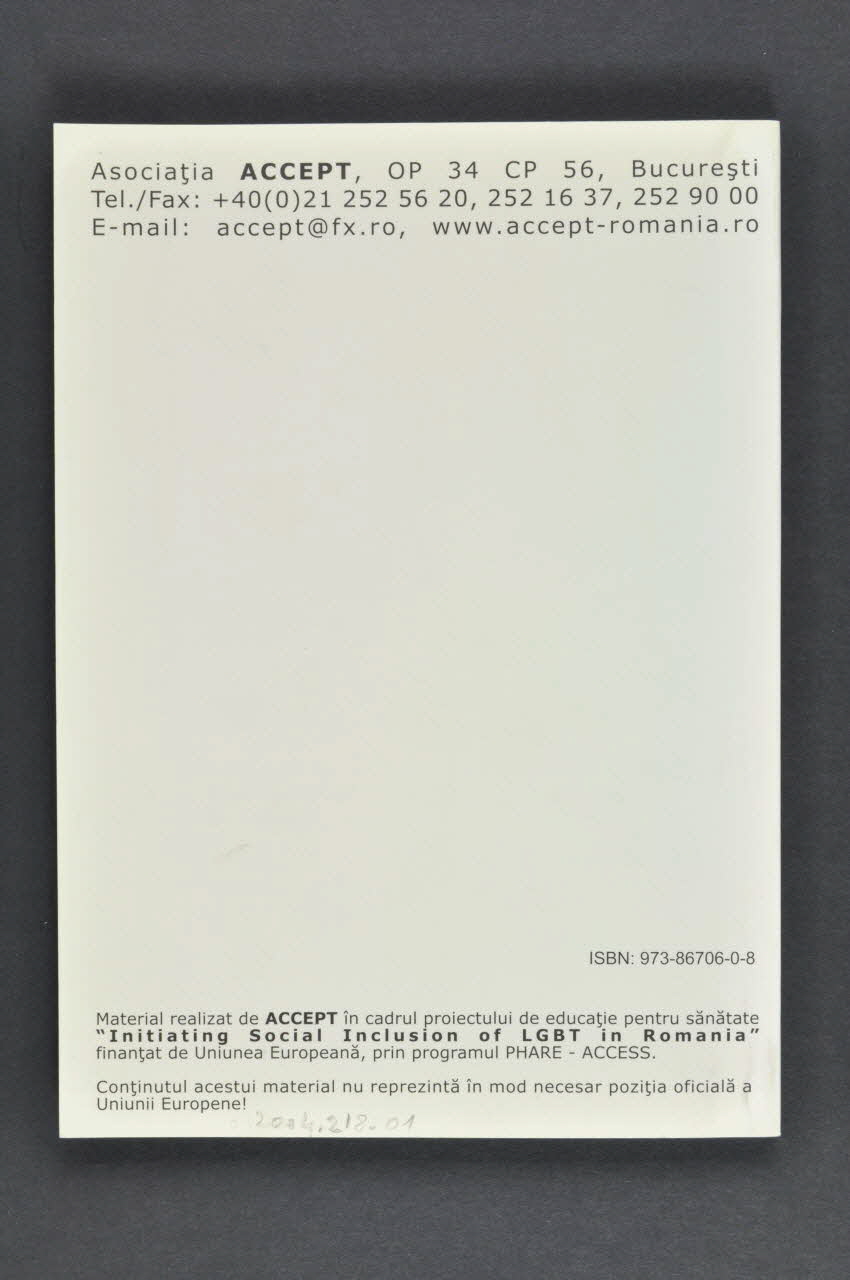 Asociatia ACCEPT, OP 34 CP 56, Bucuresti // Tel. Fax: +40(0)21 252 56 20, 252 16 37, 252 90 00 // E-mail: accept@fx.ro, www.accept-romania.ro (Dans la partie supérieure, en caractères noirs), versoSommaire