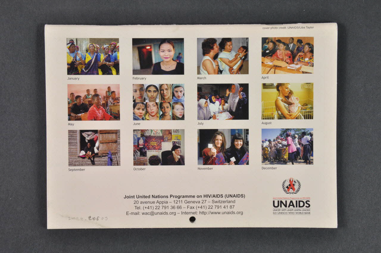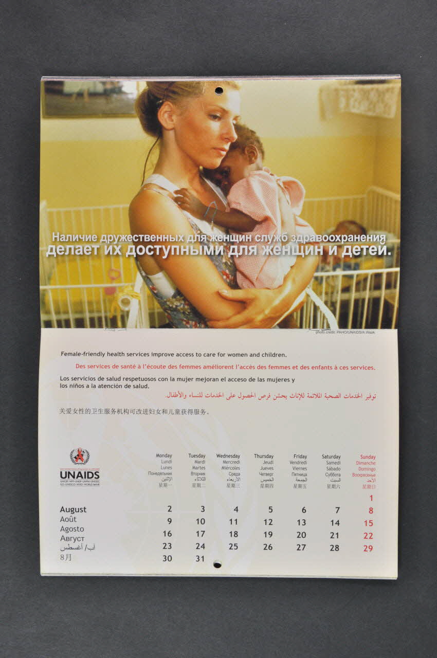 - Janvier. Photo d'un groupe de femmes africaines et commentaire en français : "Les femmes séropositives au VIH ont un rôle unique et précieux à jouer, tant au sein de la socité que dans le combat conre le VIH et le SIDA" - Février. Photo d'un visage féminin en premier plan et commentaire en chinois. Traduction :"De nombreuses femmes et filles sont vulnérables au VIH à cause du comportement à haut risque des autres" - Mars. Photo de deux femmes (mère et grand mère ?) tenant un nourrisson et commentaire en espagnol. Traduction : "Les femmes assurent souvent la cohésion des familles et des communautés et sont une immense source de force face au VIH et au Sida" - Avril. Photo de femmes noires dans une réunion et commentaire en anglais. Traduction :"Les femmes leaders doivent être encouragées à parler haut et fort du VIH et du sida" - Mai. Photo d'une salle de classe avec des jeunes filles noires et commentaire en arabe. Traduction : "L'éducation des jeunes filles réduit leur vulnérabilité au VIH" - Juin. Photo de 8 visages de femmes, blancs et noirs et commentaire en chinois. Traduction : "Les femmes peuvent aider à permettre à d'autres de lutter contre le VIH et le sida" - Juillet. Photo d'un groupe de femmes en foulard en écoutant une autre qui porte également le foulard et commentaire en arabe. Traduction : "Les femmes peuvent travailler avec les organisations confessionnelles et au sein de ces dernières pour lutter contre la stigmatisation et la discrimination liées au VIH" - Août. Photo d'une chambre d'hôpital. Femme blanche (infirmière ?) tenant un bébé noir dans les bras et commentaire en russe. Traduction : "Des services de santé à l'écoute des femmes améliorent l'accès des femmes et des enfants à ces services" - Septembre. Photo d'une femme noire à la fenêtre d'une baraque en bois et commentaire en espagnol. Traduction :"La protection des droits des femmes en matière de propriété et d'héritage maintient la cohésion des familles." - Octobre. photo d'une femme blanche au téléphone. Derrière elle, affiches sur le sida et commentaire en russe. Traduction : "La violence à l'encontre des felmmes peut accélérer la propagation du VIH et ne doit pas être tolérée" - Novembre. Photo de deux femmes blanches souriantes tenant un préservatif et commentaire en français : "Un éventail plus large d'options de prévention oeut donner aux femmes le pouvoir de se protéger" - Décembre. Photo d'un groupe de femmes africaines faisant la queue et comentaire en anglais en haut et en bas. Logo de la campagne : "Treat 3 million by 2005" Traduction : "Des travaux sont en cours pour faire en sorte que 3 millions de personnes (dont au moins la moitié de femmes) reçoivent une thérapie antirétrovirale d'ici à la fin de 2005" Les dernières pages (1 par langue) commentent les objectifs de la campagne et présentent ONUSIDA.