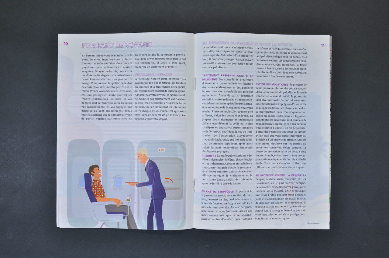 Avant de partir : // Consultez votre médecin // Voyager en Europe // Vaccinations // Que mettre dans ses bagages ? // Législation // Pendant le voyage : // Dans les transports // Se protéger du paludisme // Sur le sable : // Le soleil, un faux ami ? // Que boire en vacances ? // Lutter contre la diarrhée // Alimentation et hygiène // A votre retour // Tableau des molécules // Adresses utiles. (en bas à gauche de la page 3), à l'intérieurConcernant le lieu d'édition