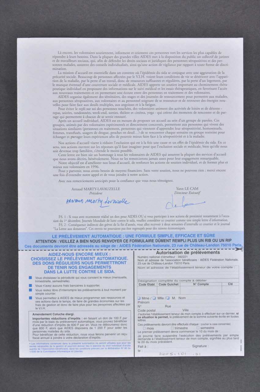 L'affaire de l'ARC' a inévitablement rejailli sur la confiance des donateurs à l'égard de l'ensemble des associations. C'est pourquoi nous tenions à vous écrire à nouveau que, chaque année, les comptes de AIDES sont contrôlés et certifiés par un commissaire aux comptes (...). Aujourd'hui, nous souhaitons vous informer sur les moyens d'accueil qu'AIDES met à la disposition des personnes malades du sida, affectées par l'infection à V.I.H. et de leurs proches. / L'accueil est au coeur même de l'action de AIDES : 3 600 volontaires, engagés solidairement et bénévolement, accueillent et soutiennent les personnes affectées par le V.I.H. / AIDES s'emploie avec beaucoup de détermination à proposer diverses formes d'accueil auprès des personnes affectées par le sida. / Depuis sa création, AIDES a développé des permanences d'accueil téléphonique : elles permettent à toute personne de poser anonymement des questions sur la maladie, la prévention, les comportements sexuels. Aujourd'hui quotidiennes, ces permanences se sont étendues nationalement et fonctionnent dans le cadre de Sida Info Service. L'écoute est effectuée par des professionnels, sauf de 19 h à 23 h om la permanence est assurée par des volontaires de AIDES. Un service d'assistance juridique par téléphone (Sida Info Droit) a également été créé. / D'autres volontaires accueillent quotidiennement et individuellement les personnes touchées dans les lieux d'accueil AIDES. /Là encore, les volontaires soutiennent, informent et orientent ces personnes vers les services les plus capables de répondre à leurs besoins. Dans la plupart des grandes villes, AIDES met à la disposition du public un collectif de juristes et de travailleurs sociaux, qui, afin de défendre les droits sociaux et juridiques des personnes séropositives et des personnes malades, assurent des conseils individualisés, ainsi qu'une action de vigilance par rapport à toute forme de discrimination. / La mission d'accueil est essentielle dans un contexte où l'épidémie du sida se conjugue avec une aggravation de la précarité sociale. Beaucoup de personnes affectées par le V.I.H. voeint leurs conditions de vie se détériorer avec l'apparition de la maladie, par la perte d'un travail, donc de ressources suffisantes et régulières, par la perte d'un logement, par le manque éventuel d'une couverture sociale et médicale. AIDES apporte un soutien important au cheminement thérapeutique individuel en proposant des informations sur le suivi médical et les essais thérapeutiques, en favorisant l'accès aux nouveaux traitements et en permettant une écoute entre des personnes en traitement et des volontaires. / AIDES organise également des séminaires, des stages et des journées de ressourcement pour permettre aux malades, aux personnes séropositives, aux volontaires et au personnel soignant de se ressourcer et de retrouver des énergies nouvelles pour faire face aux deuils multiples, aux angoisses et à la fatigue. / Pour éviter le repli sur soi des personnes touchées, des volontaires animent des activités de loisir et de détente - repas, soirées, randonnées, week-end, sorties, théâtre et cinéma, yoga - qui créent des moments de rencontre et de partage qui permettent à chacun de se sentir entouré. / Après un accueil individuel, AIDES est en mesure de proposer un accueil au sein d'un groupe de paroles. Ces groupes, animés par des volontaires expérimentés et directement concernés, permettent aux personnes qui vivent des situations similaires (personnes en traitement, personnes qui viennent d'apprendre leur séropositivité, homosexuels, femmes, transfusés, usagers de drogue, proches en deuil...) de se rencontrer chaque semaine en groupe restreint pour échanger et partager leurs expériences afin de pouvoir mieux faire face à la séropositivité et à la maladie. / Nos actions d'accueil visent à réduire l'exclusion qui est à la fois une cause et un effet de l'épidémie du sida. En ce sens, nos actions ouvrent sur les réponses qu'il faut imaginer pour que l'exclusion sociale et médicale, bien qu'elle nous soit devenue trop familière, s'étende le moins possible. / Cette lettre est bien sûr un hommage à tous les volontaires de AIDES qui assurent la plupart des services d'accueil que nous avons décrits, bénévolement. Nous ne les remercierons jamais assez pour leur engagement remarquable // [...] // // Arnaud Marty-Lavauzelle // président // // Yann Le Cam // Directeur exécutif (extraits du texte de la lettre.), au centre