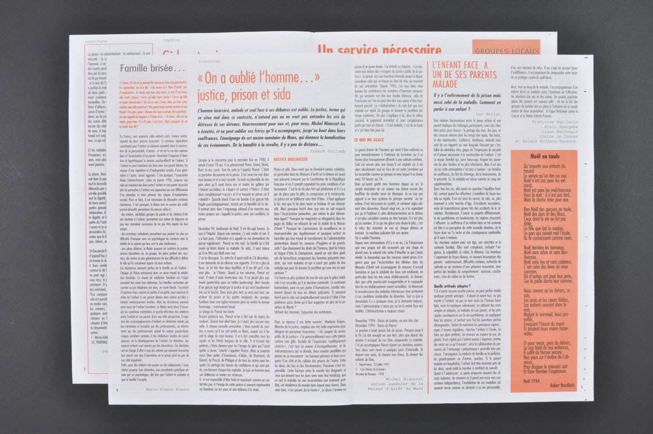 p. 2 Jean-Michel Belorgey, président de C & S Ouverture (présentation du n° : les prisons) p. 2-3 Didier Sicard, professeur de médecine interne à Cochin où est rattachée l'Unité de Consultation et de Soins Ambulatoires de la Santé, Sida et prison (la notion de secret, la peur des autres détenus, le dépistage anonyme comme droit essentiel, les seringues et les préservatifs, les traitements et le problème de la sortie) (repris dans le n°37) p. 3 Extrait d'un courrier d'un détenu p. 4 Marie-France Bianco Famille brisée... (présentation de l'association relais Enfants-Parents qui aide au maintien des liens entre enfants et parents incarcérés) p. 4-5 Michel Niaussat, ancien aumônier de la maison d'Arrêt du Mans, "On a oublié l'homme... justice, prison et sida" (conditions inhumaines de détention... "Que deviennent les droits de l'homme, dont la France se targue d'être la championne, quand on sait dans quels culs de basse-fosse croupissent des hommes présumés innocents, qui sont malades et qui n'osent pas parler de leur maladie par peur de devenir le pestiféré qui sera mis en quarantaine? " p. 5 Françoise May-Levin, Alain Bourgeba, Ligue Nationale contre le Cancer et relais Enfants-Parents L'enfant face à un de ses parents malade (accompagnement, groupes de parole...) p. 5 Robert Brazillach, Noël 1944, poème Noël en taule p. 6 Anne Lécu, médecin à Fleury Mérogis, Quitter la fascination (secret, seringues, préservatifs, parler clairement avant de toucher le corps) p.7 Werner Burji, aumônier des prisons, Un service nécessaire et inutile (reconnaître l'image de Dieu dans la personne visitée) p. 7 revue de presse p. 7 groupes locaux p.8 Jean-François Leroux-Dhuys, président de l'association renaissance de l'Abbaye de Clairvaux et président de la charte des abbayes cisterciennes Clairvaux abbaye et prison,(notes historiques, de Clairvaux abbaye à Clairvaux prison)