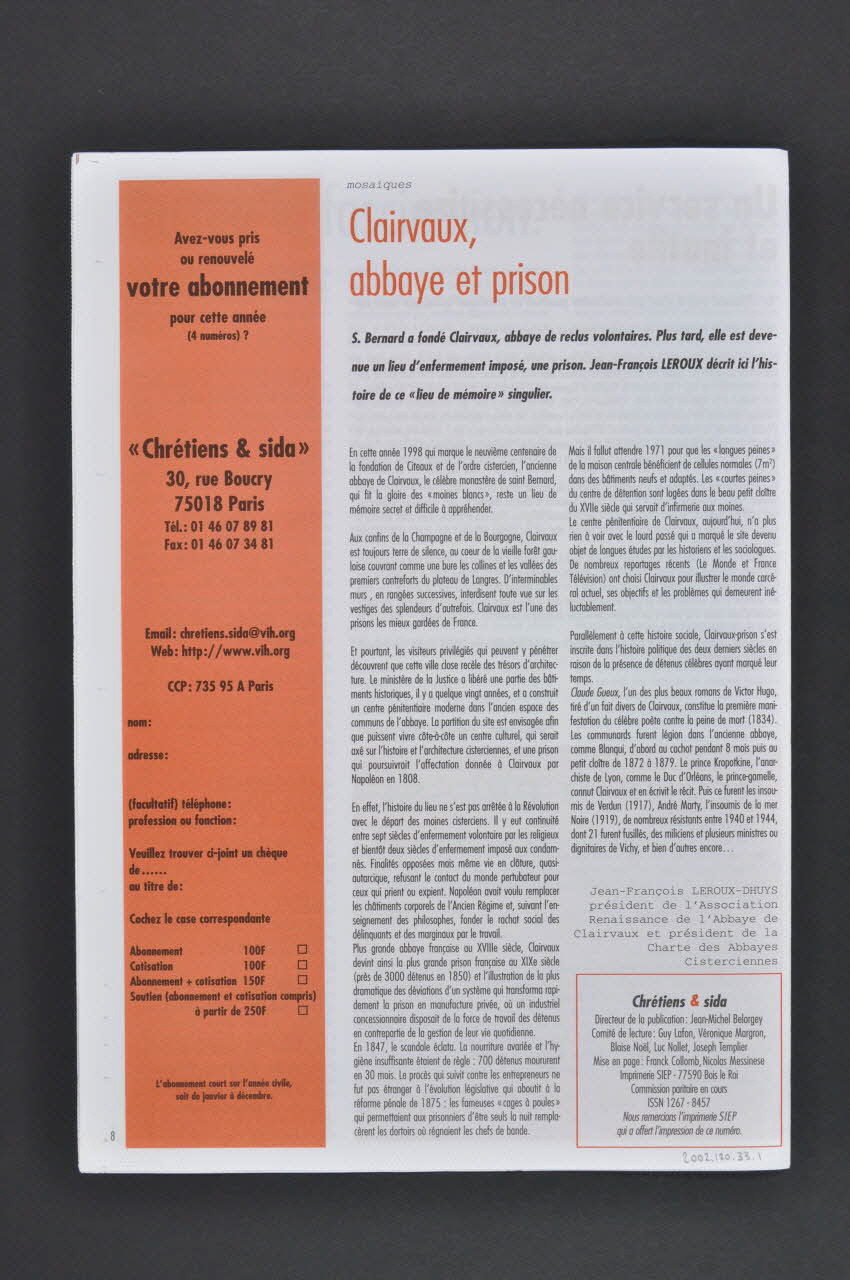 ouverture // Jean-Michel BELORGEY // // repères // Didier SICARD // Sida et prison // // traverses // Michel NIAUSSAT // "On a oublié l'homme..." // justice, sida et prison. // // mosaïque // Jean-François LEROUX-DHUYS // Clairvaux, abbaye et prison (En première page)Date