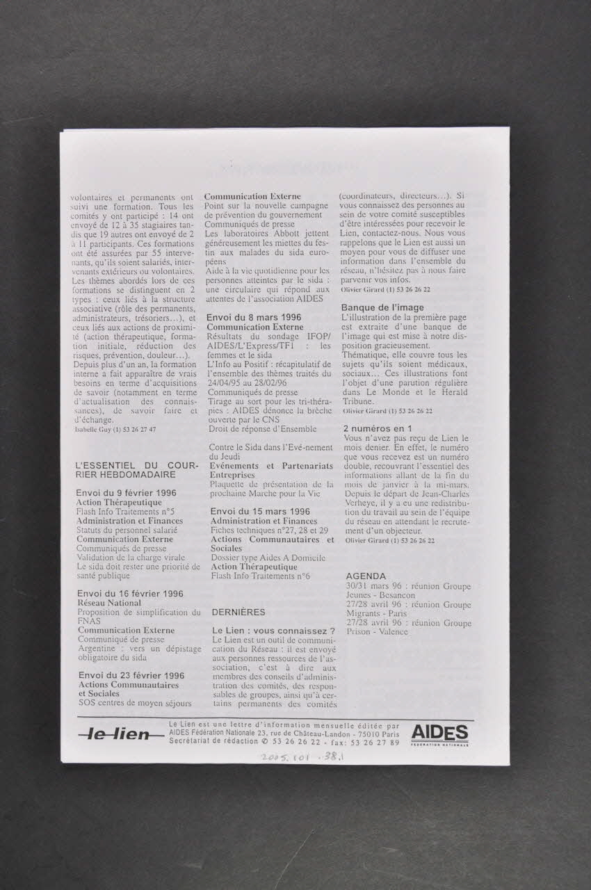 Il s'agit d'une publication mensuelle destinée aux volontaires de l'association, donnant de courtes informations sur la vie de l'association. - p.1 Sommaire et dessin d'une mitrailleuse : "Les labos et les traitements" - p.2 Actualité : Sida et budget (manifestation devant le Ministère de la Santé contre le budget trop faible) / Arc en ciel (inauguré le 19 février 1996) / Sidaction (prévu le 6 juin 1996) - p.3-5 Vie associative : Assemblée générale / ECS (réserves à la présidence de Pierre Bergé) / Nouvelles règles du FNAS / Statuts de l'association et des salariés / Dynamique communautaire en Afrique (chez les africains vivant en France) / Aide à domicile / Groupe national Accès aux soins / Commission nationale soutien / Journée nationale de Prévention Minitel / Groupe national Prison / Groupe national PTL /Groupe national Migrants / Réunion femmes - p.5 Programmes et départements : Action thérapeutique : Conférence de Washington sur les rétrovirus et les infections opportunistes (efficacité des traitements et mesure de la charge virale) / Essais thérapeutiques : représentant de l'ANRS à AC-5 de l'ANRS. Communication externe : L'info au positif sur Libération, France Info, le Quotidien du médecin et la 5ème. - p.5-6 Evénements : Marche pour la vie 1996 / Manifestation du 9 février devant le Ministère de la Santé contre le budget trop faible ; rendez vous avec le Ministre Hervé Gaymard. / Formation interne