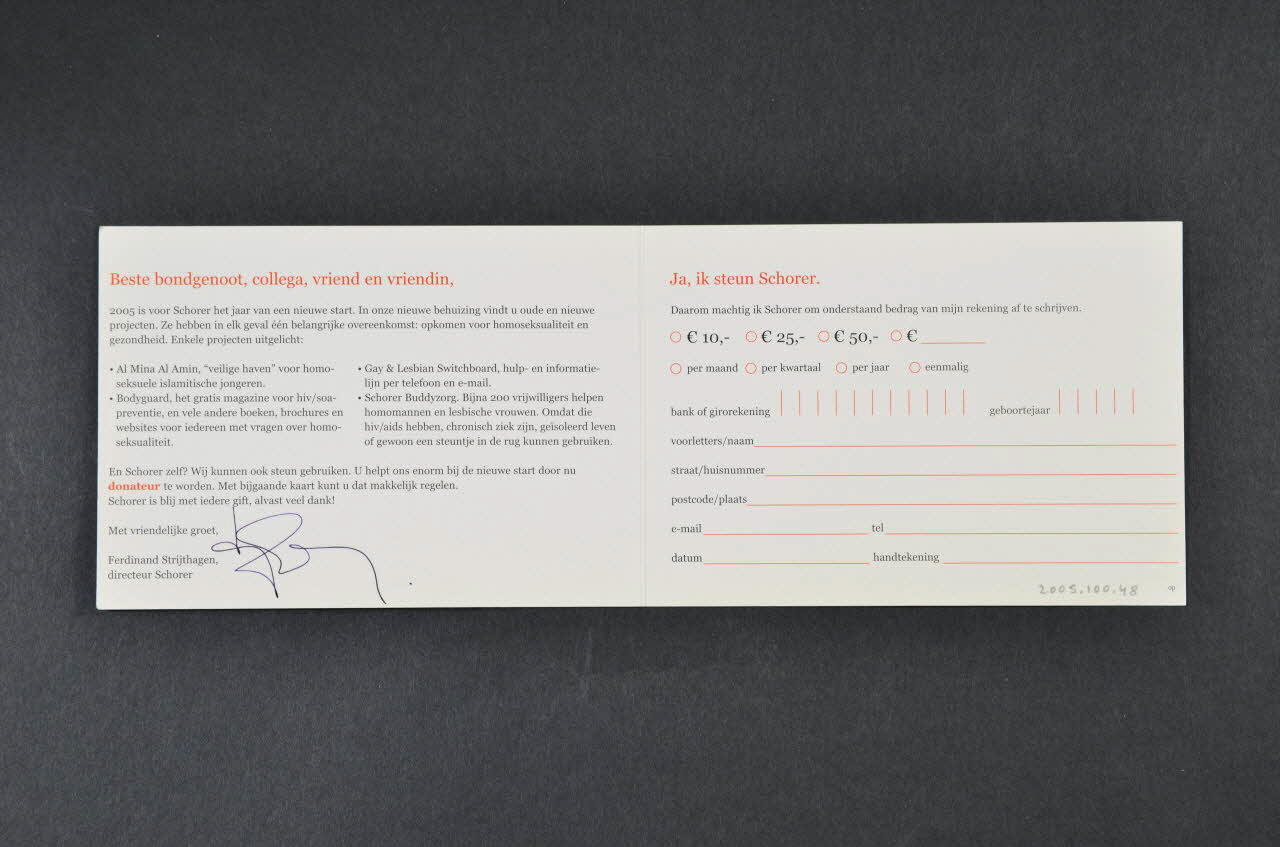 Beste bondgenoot, collega, vriend en vriendin, // 2005 is voor Shorer het jaar van een nieuwe start. [...] (Imprimé en rouge et noir sur blanc, sur le volet gauche), à l'intérieurConcernant le lieu d'utilisation