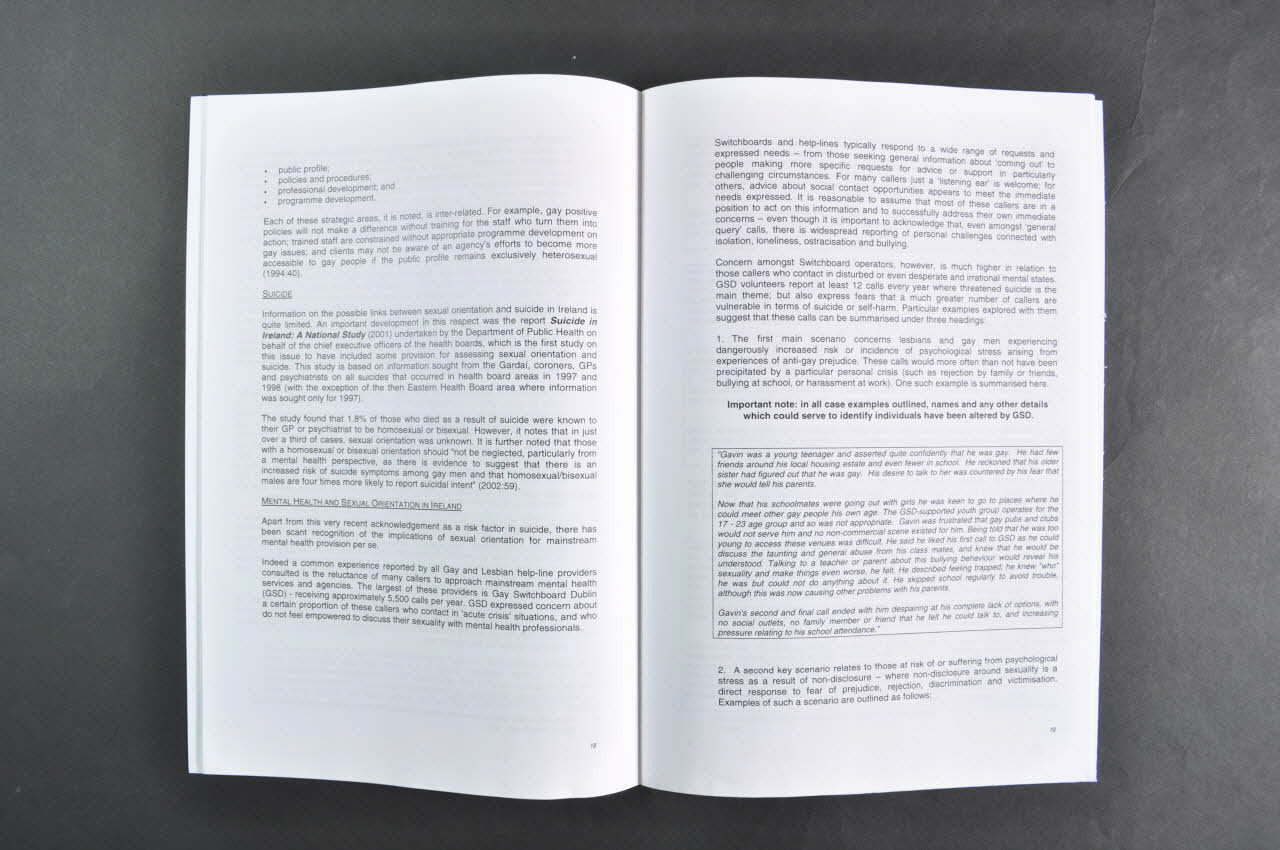 - Le contexte politique à l'égard des gays en Irlande au niveau de la politique générale (dispositions législatives par rapport à l'égalité) et au niveau communautaire ( lignes téléphoniques gays, centres communautaires, services liés au sida comme the gay Men's Health Project, journaux et festivals, groupes de pression politique comme The Gay and Lesbian Equality Network ou Gay HIV Strategies.
