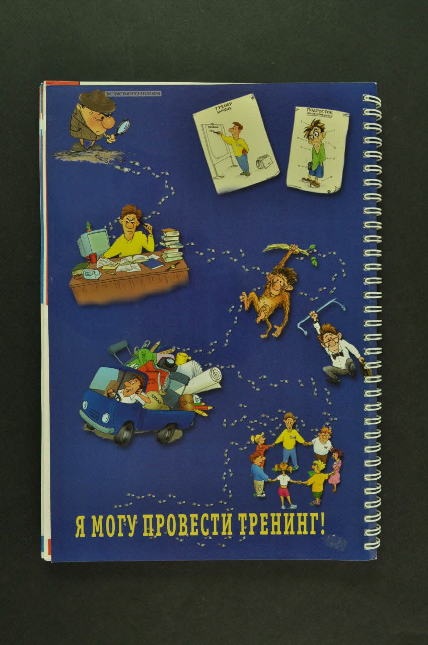 De format rectangulaire et vertical, la brochure est composée de deux cent six pages en papier glacé, reliées par une spirale métallique blanche. La couverture est en papier plastifié bleu. A u recto, une inscription est imprimée en jaune en bas et un personnage avec une loupe est imprimé en couleur dans le coin supérieur droit. Au verso, plusieurs scènes sont imprimées en couleur, reliées par des pas : le personnage avec une loupe, un homme assis à son bureau et réféchissant, un singe accroché à une branche, un homme conduisant un camion rempli de matériel, sept personnes formant un cercle.