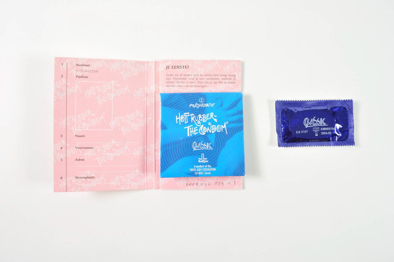 En dessous, figure le logo de The Hot Rubber. Au dos du dépliant, on trouve un texte en petits caractères noirs, en néerlandais, présentant Hot Rubber The Condom. A l'intérieur, le dépliant présente six volets reprenant les catégories des permis de conduire : volet 1 : nom, adresse... volet 2 : nom de l'association aux Pays Bas qui distribue les préservatifs fabriqués en Suisse : Stichting Safe Service volet 3 : présentation des types de préservatif Hot Rubber volet 4 : présentation du distributeur volet 5 : présentation du préservatif volet 6 : collé sur le volet, dans une enveloppe carrée en carton bleu, est rangé un préservatif contenu dans une pochette rectangulaire bleue.Inscriptions