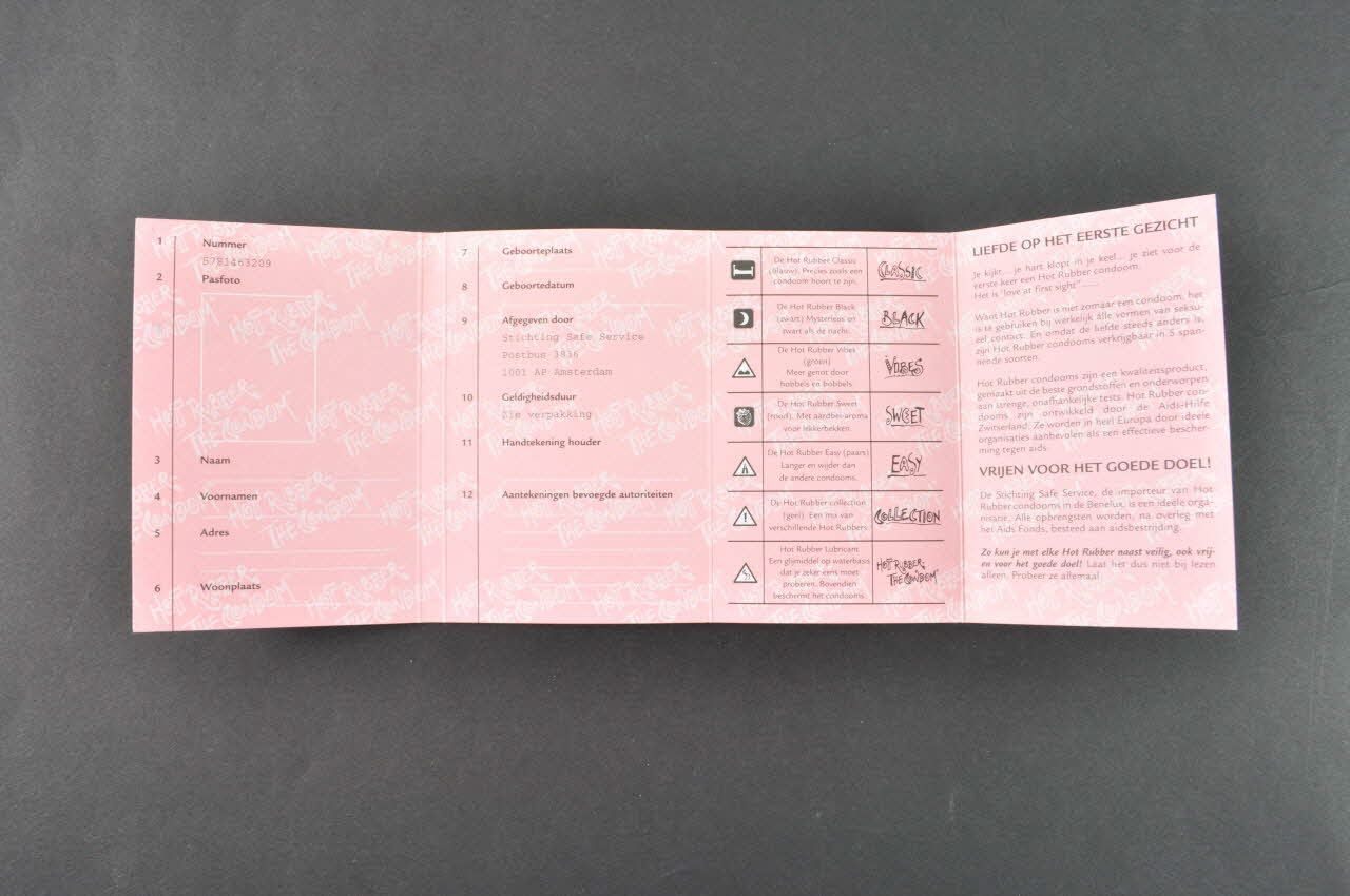 Petit dépliant en carton rose, imitant un permis de conduire. Le fond est orné d'un semis en blanc, en travers, du nom de la marque : Hot Rubber The Condom. La couverture présente des inscriptions noires, et le logo des Pays-Bas entouré des étoiles du drapeau européen.