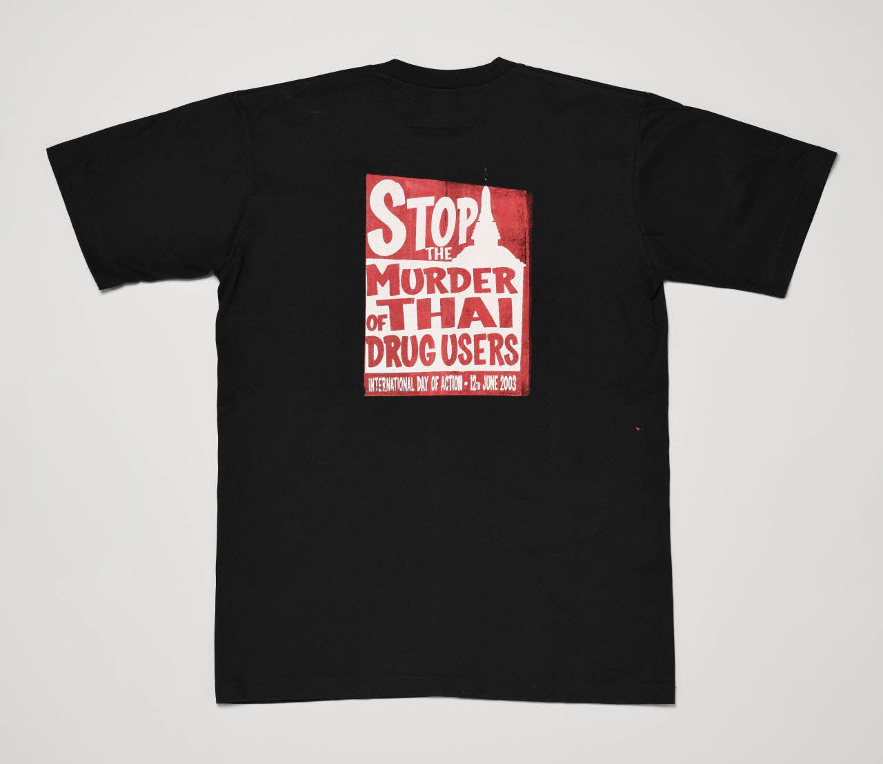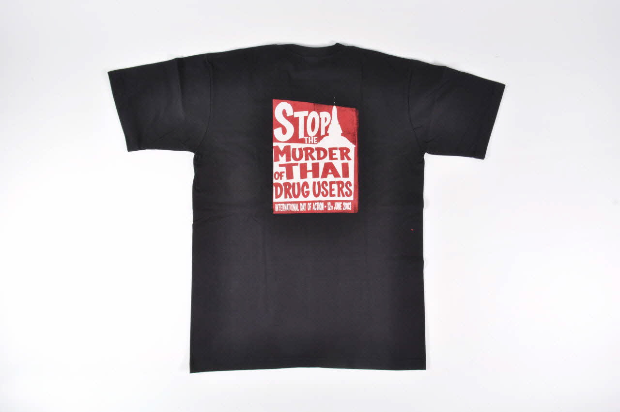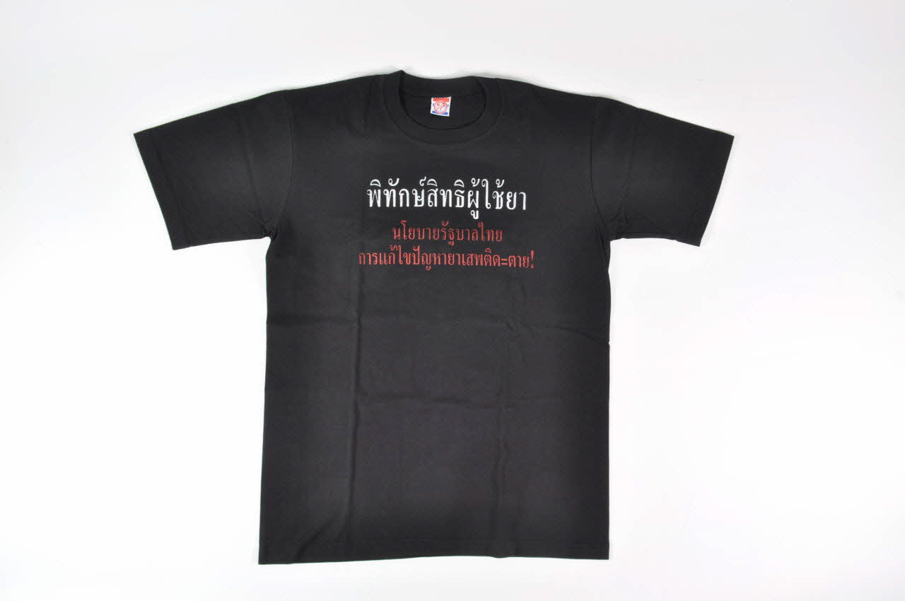Devant sont imprimées des phrases en thaï, en caractères blancs puis rouges. Dans le dos est imprimé un grand rectangle rouge, sur lequel est imprimé en blanc un édifice. Par dessus, en capitales blanches sur le rouge et rouge sur le blanc, figure une inscription.Décor