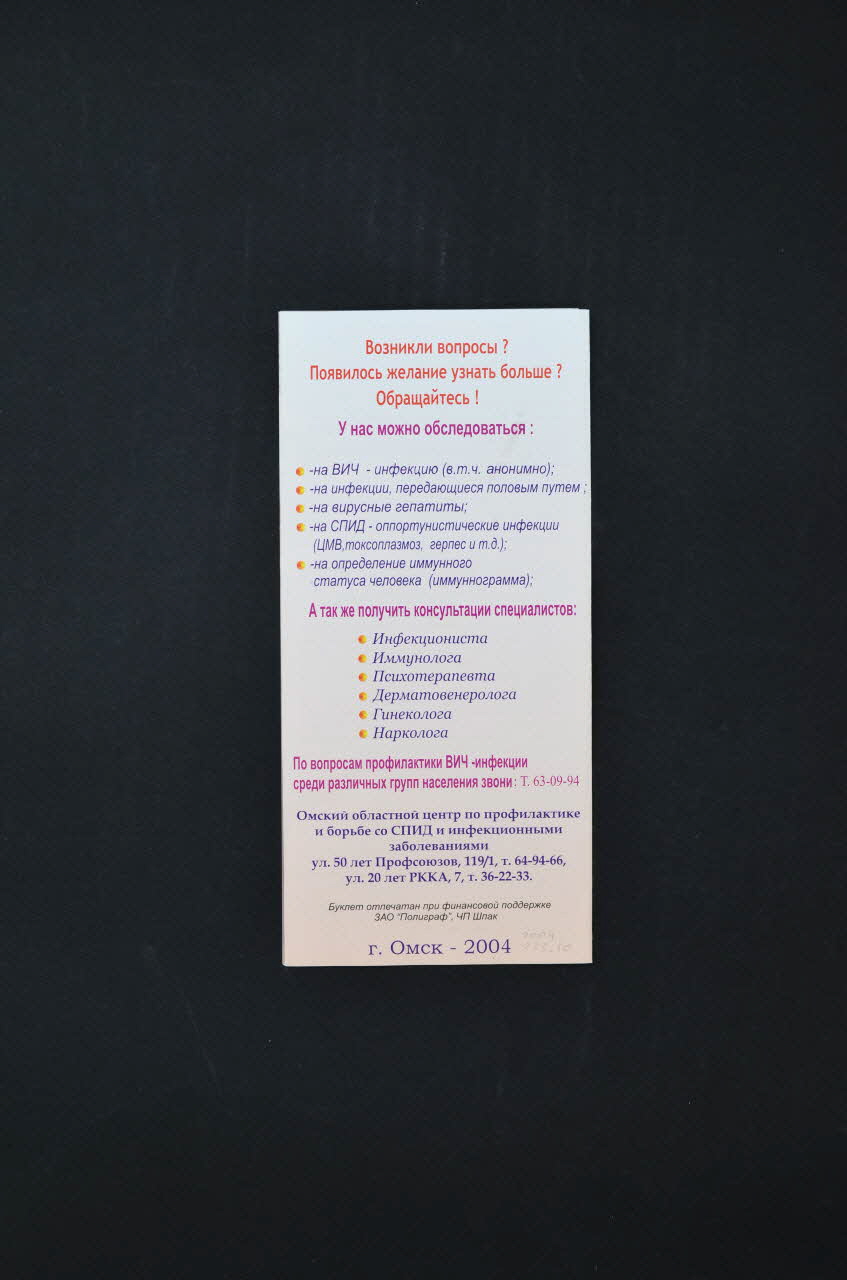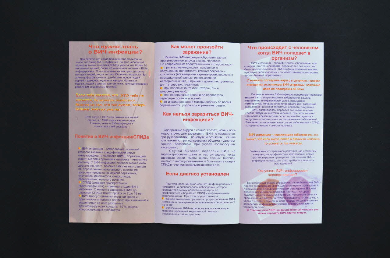 Le recto est illustré d'une photographie en couleurs où on voit une jeune femme et un jeune homme enlacés. Le titre, en caractères rouges, est inscit au centre et il est précédé d'un logo et d'un texte en cyrillique et en caractères bleus. Au verso figurent plusieurs paragraphes en caractères rouges, violets et bleus. A l'intérieur, on remarque en sous-impression deux préservatifs enmballés de couleurs rouge et violette puis, les symboles du sexe masculin et fémin (deux cercles entrelacés, un comportant une croix et l'autre une flèche). Les textes sont en caractères rouges, violets et jaunes sur fond rose.Inscriptions