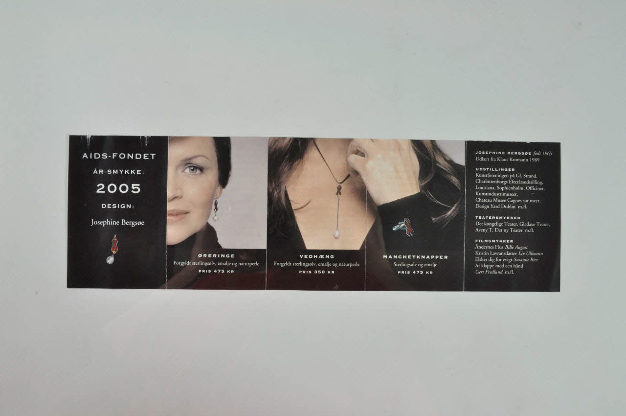 L'ensemble est contenu dans un petit sachet de velours noir fermé par un cordon rouge. A l'intérieur figure également un petit dépliant en papier imprimé, présentant les trois objets design vendus par l'association et fabriqués par Josephine Bergsoe : boucles d'oreille, pendentif et boutons de manchette. Le dépliant est tenu fermé par une agraphe en métal, pliée selon la forme d'un ruban rouge.Décor