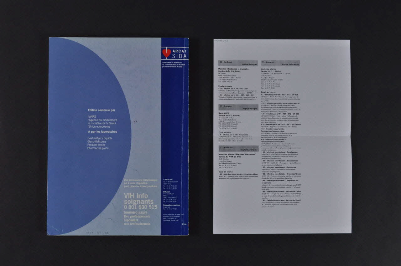 Celle-ci présente, sur un fond bleu et gris bleu, des inscriptions. A gauche, sur un bandeau vertical bleu, on trouve en haut, logo d'ARCAT SIDA (un coeur rouge traversé d'un montant blanc) et en bas, les logos de ANRS, de l'Agence du Médicament, du Ministère du Travail et des Affaires Sociales et l'Union Européenne. Le dos présente un fond identique, traversé d'inscriptions. Une feuille blanche, de format A4, sur laquelle est imprimée un erratum, est pliée en deux et glissée sous la couverture.Inscriptions